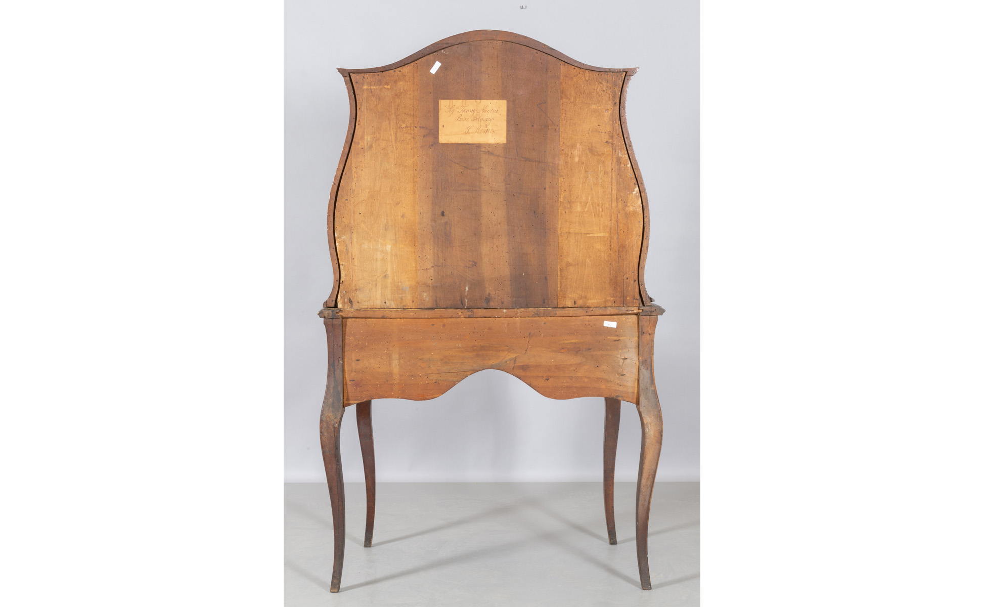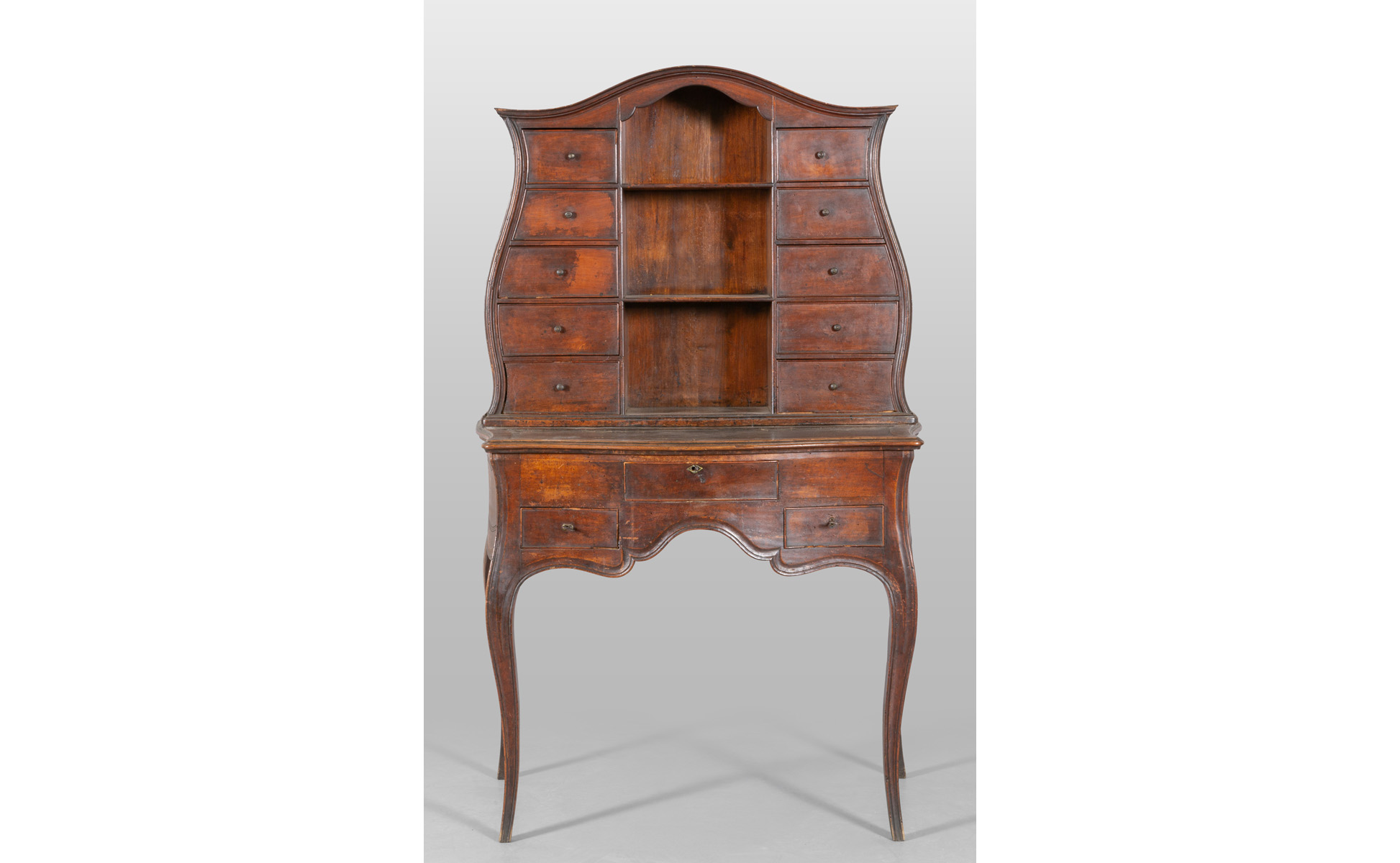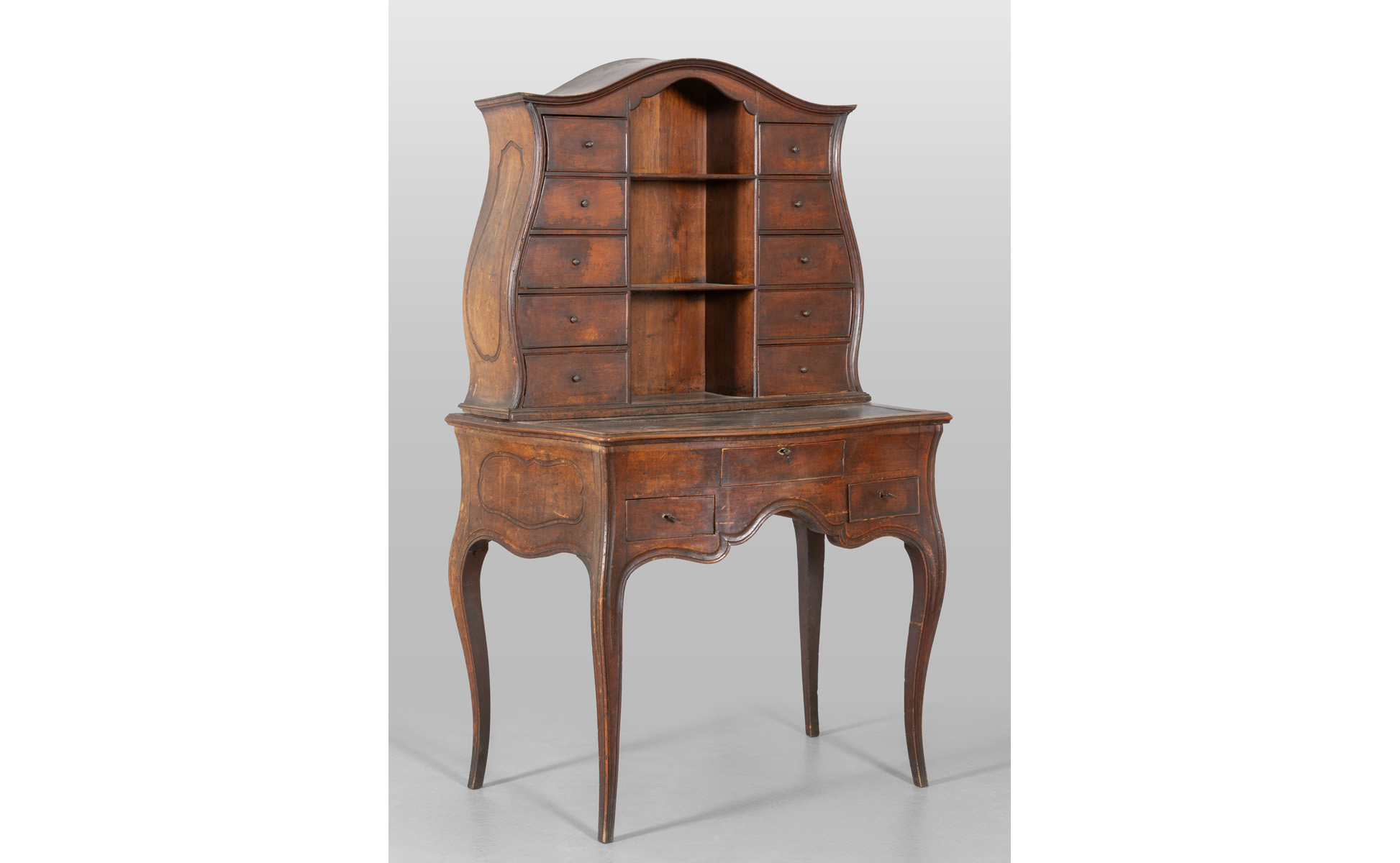Scrittoio con alzata in massello di noce scolpito a formelle laterali un cassetto nella fascia parte superiore con dieci cassetti e due ripiani a giorno Parma sec.XVIII (antico cartiglio di provenienza)