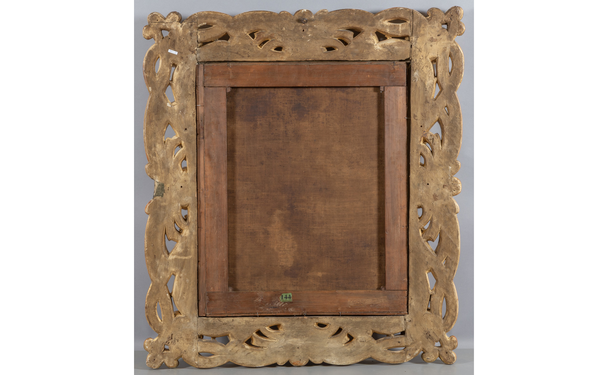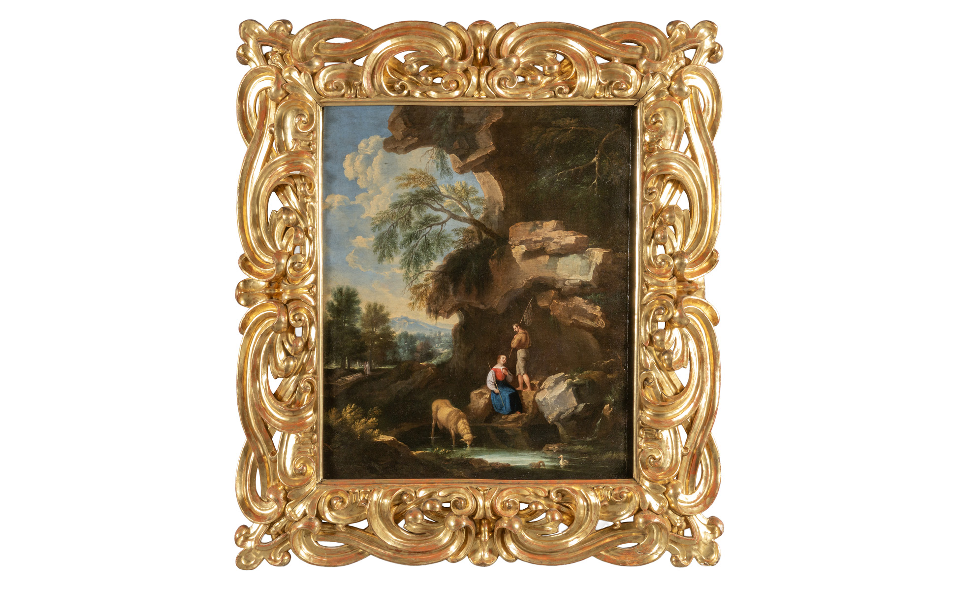 Scuola veneta sec.XVIII 'Pastori in riva al fiume' olio bella cornice in legno riccamente intagliato a volute e dorato
