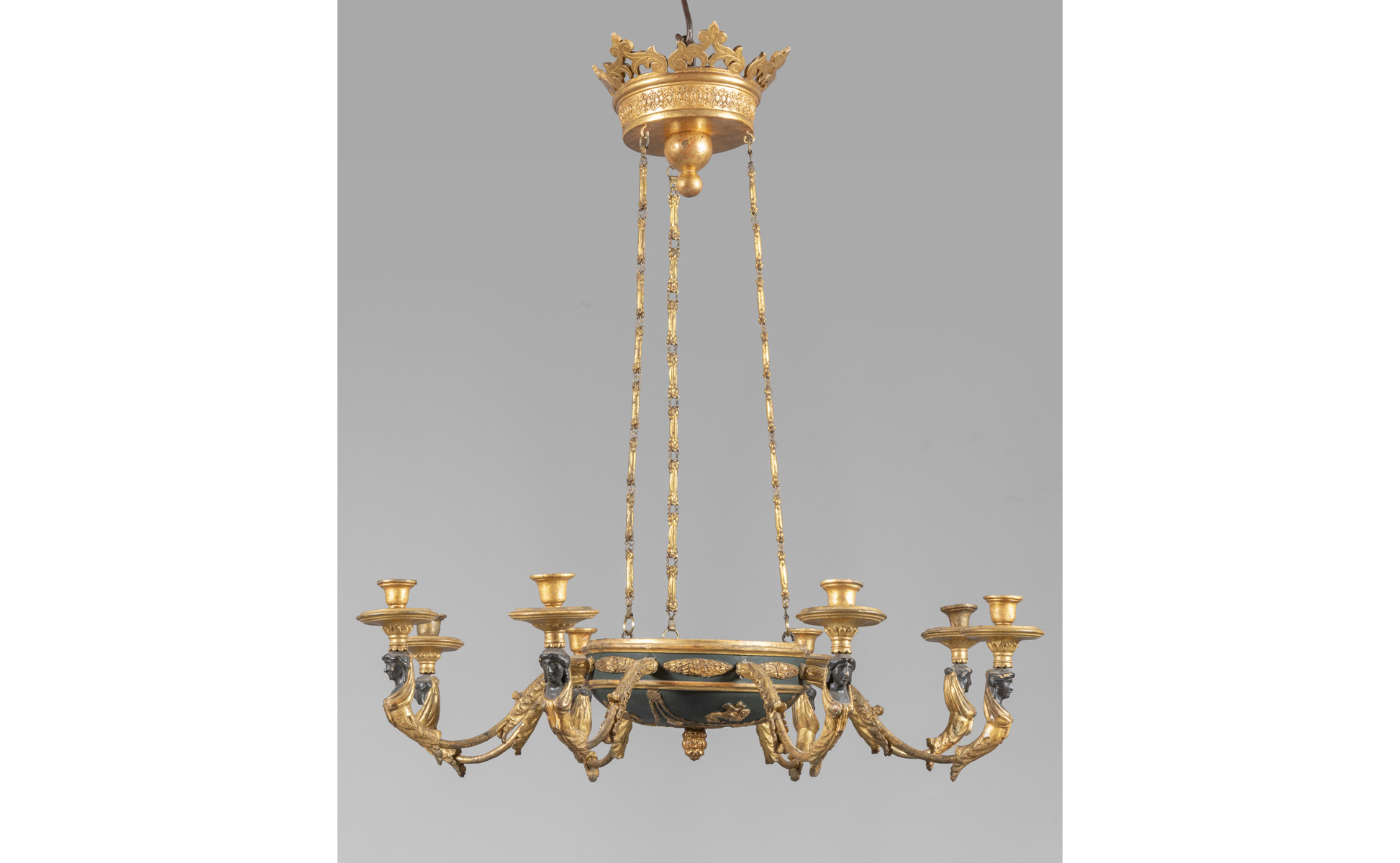 Lampadario a otto luci in legno intagliato laccato e dorato terminali dei bracci intagliati con teste inizi sec. XIX