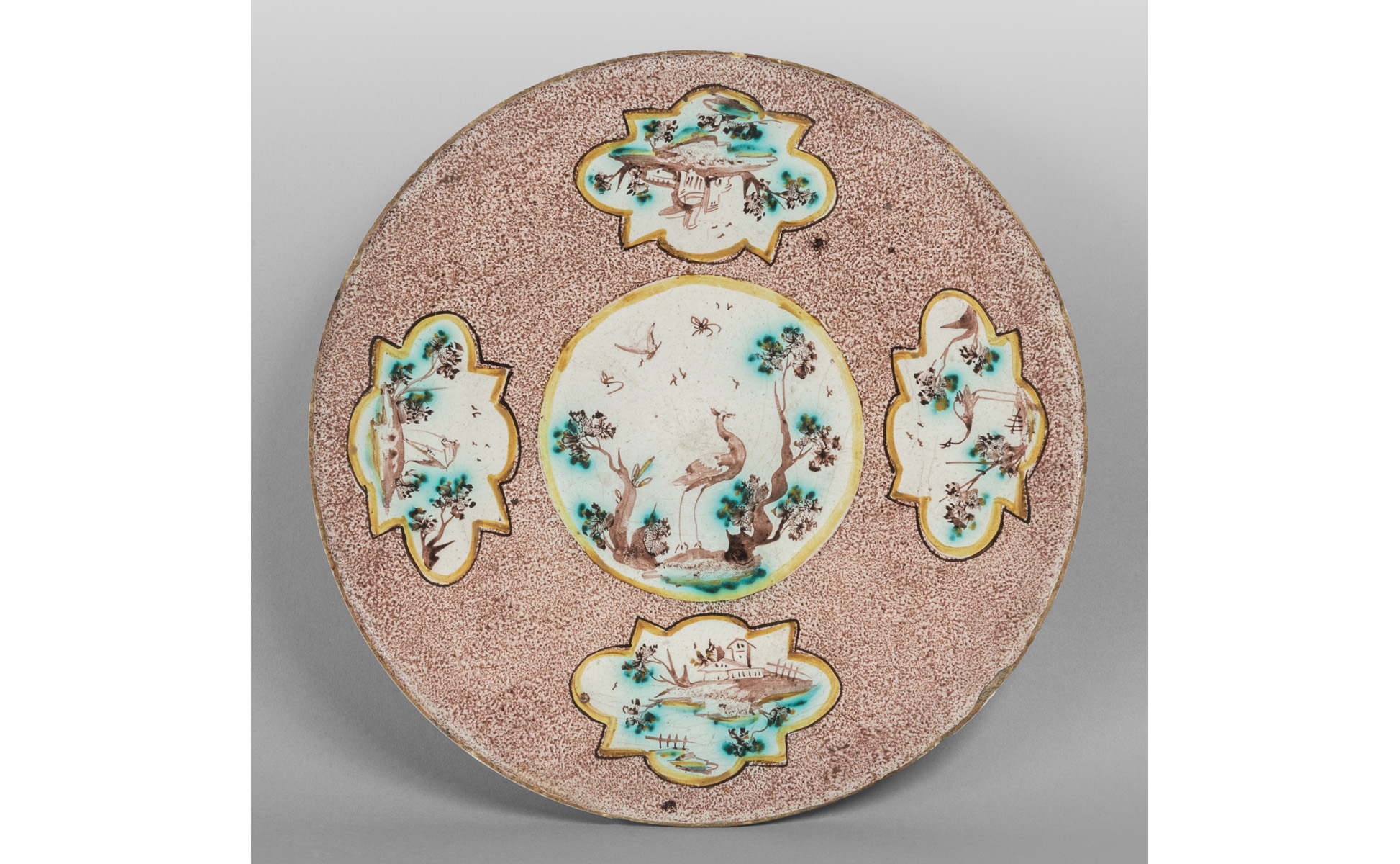 Alzata in ceramica di Savona decorata con paesaggi in policromia su fondo manganese sec.XVIII