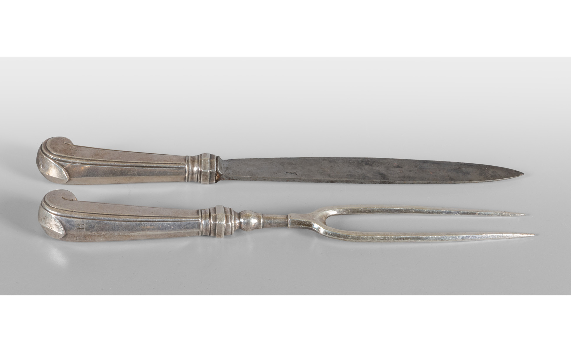 Forchettone e coltello d'arrosto in argento Genova punzone della Torretta anno 787