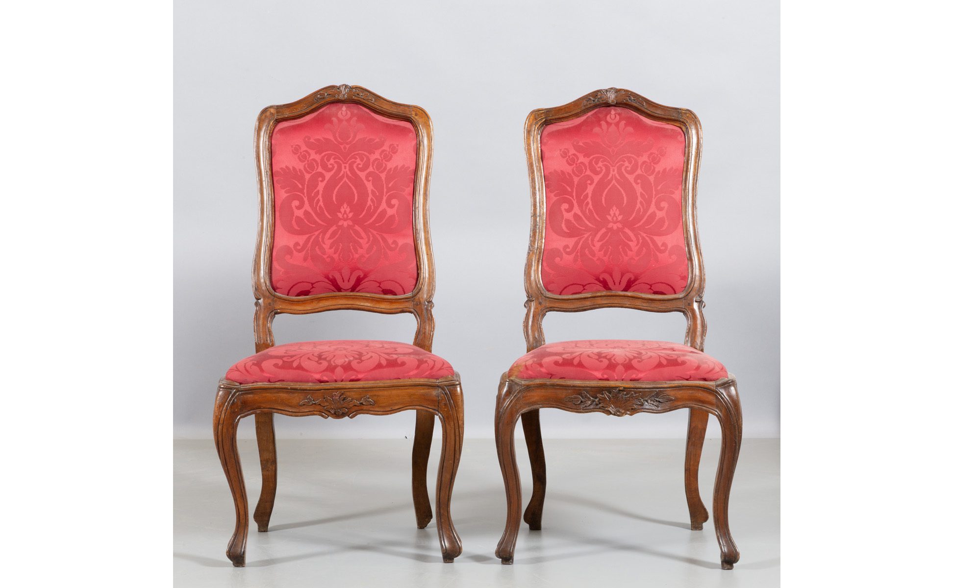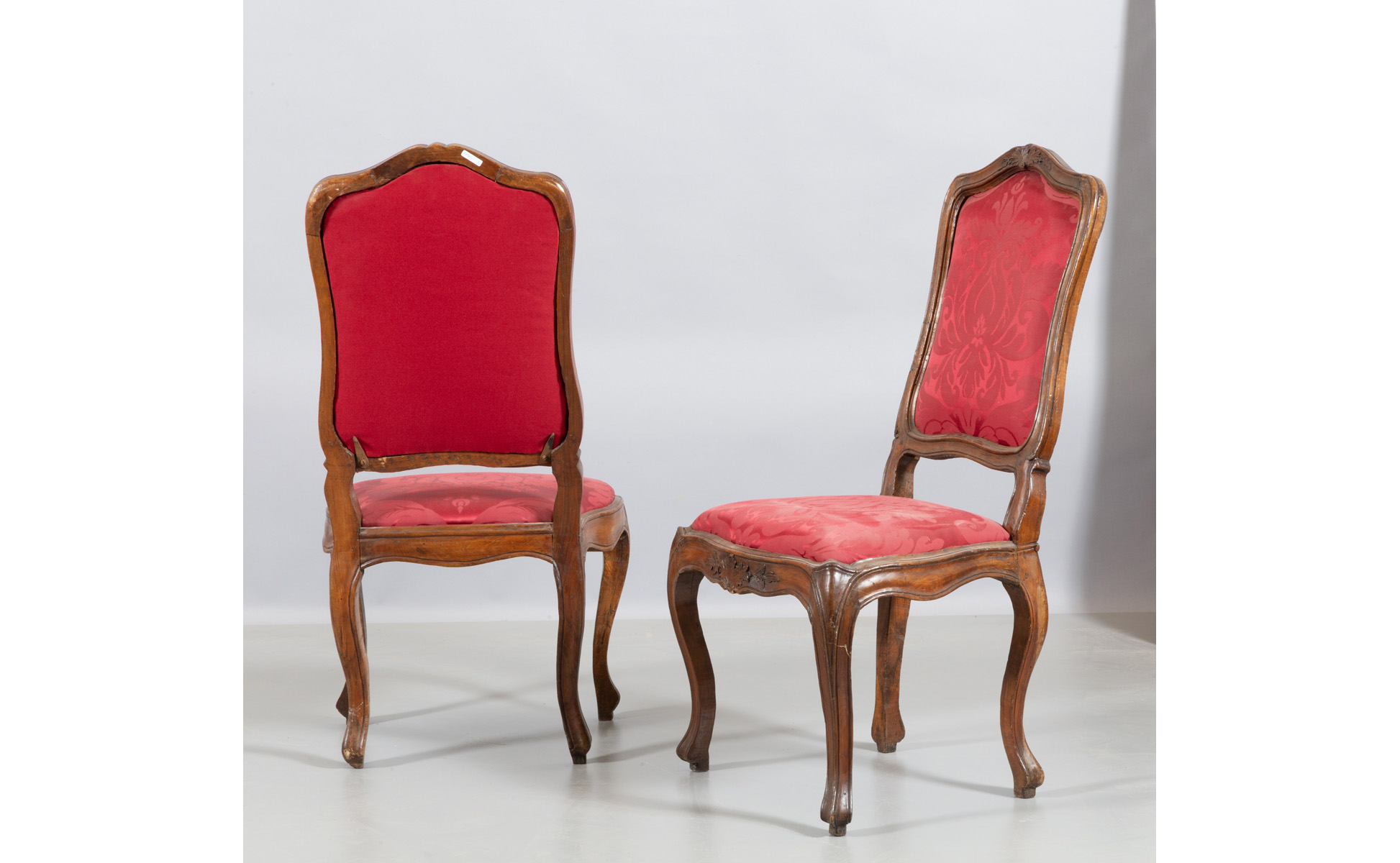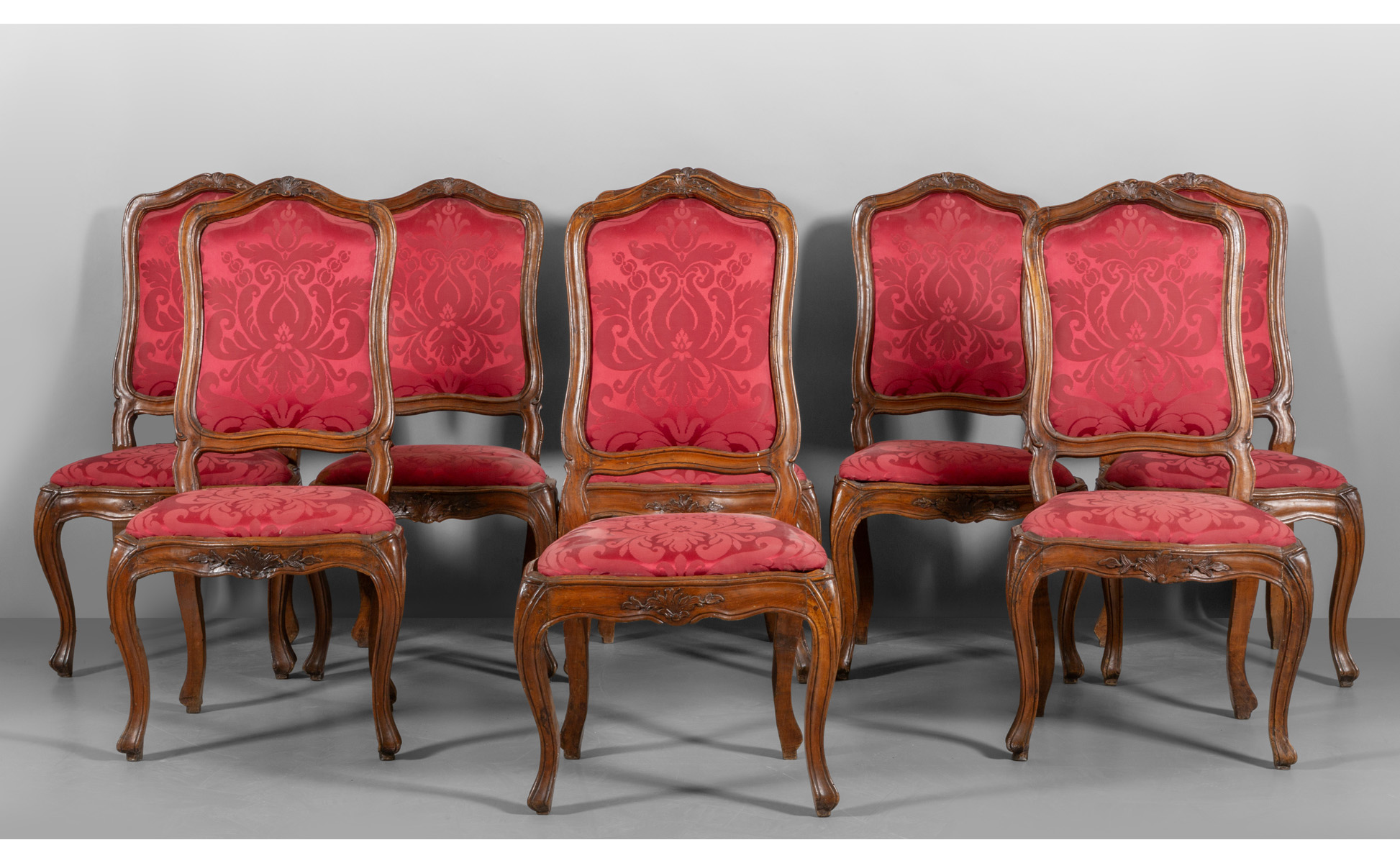 Otto sedie Luigi XV in noce intagliato con il motivo della pellaccia Genova sec.XVIII (restauri)