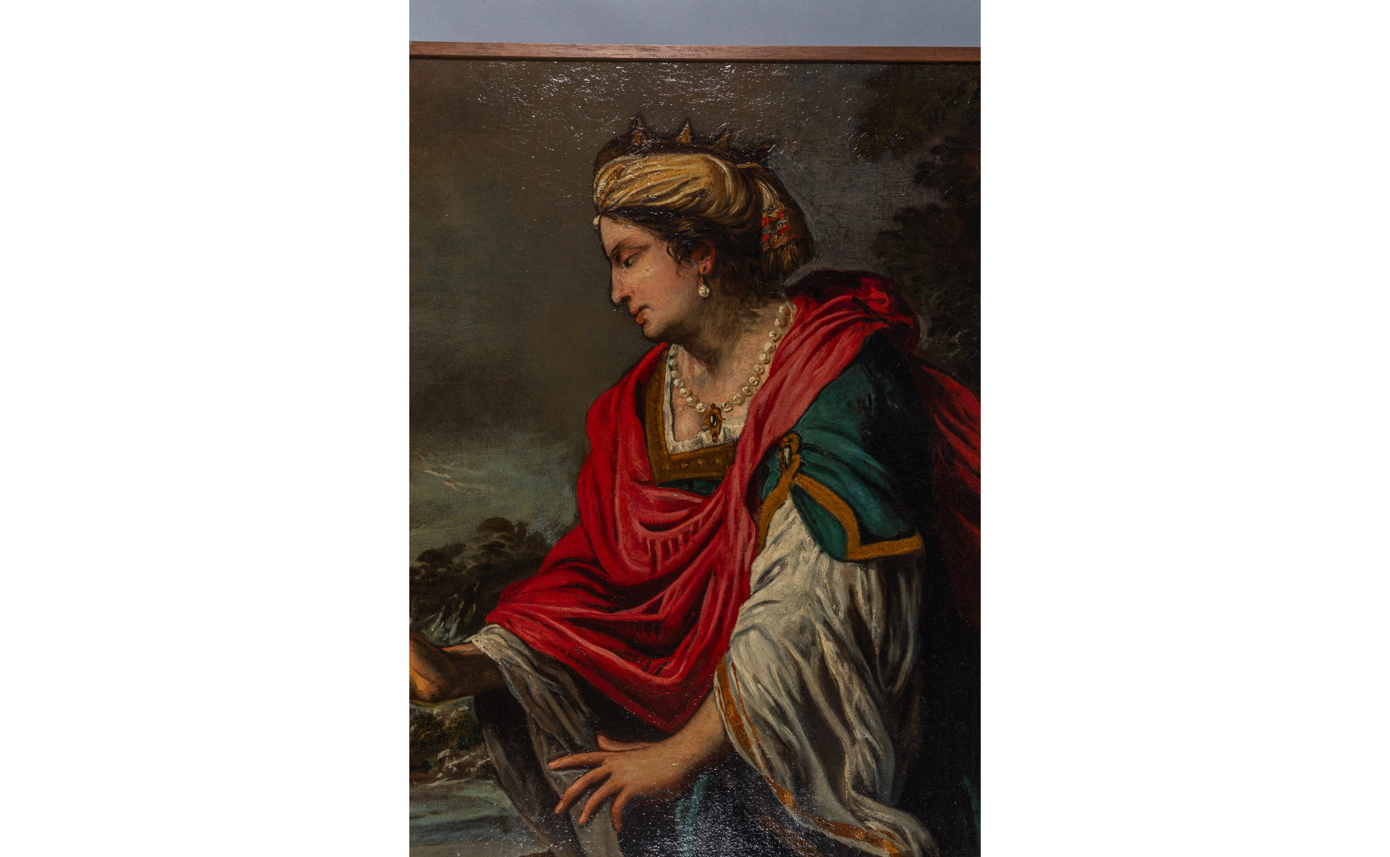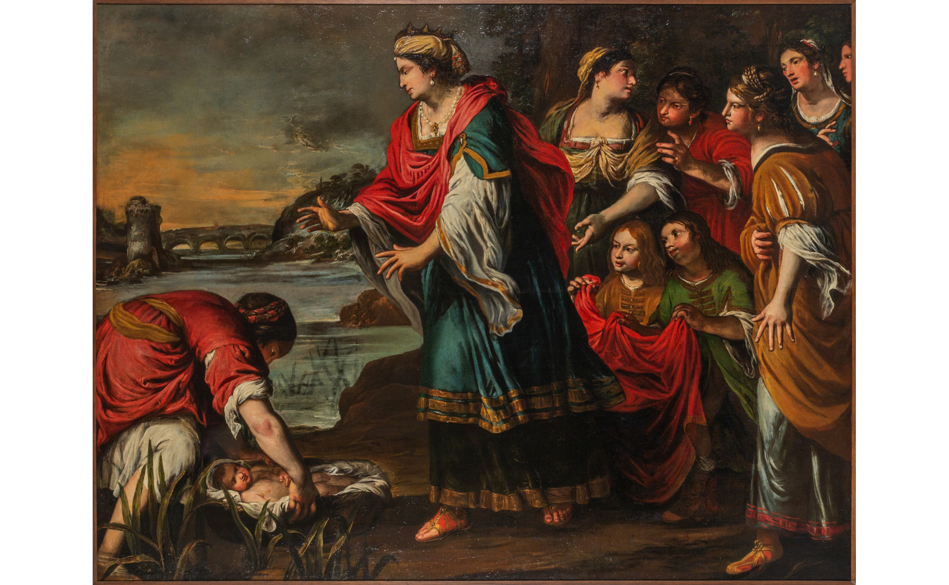 L'opera raffigura l'episodio biblico del ritrovamento di Mosè tra i giunchi del Nilo. La composizione è ricca e affollata con figure in abiti sontuosi che sottolineano il carattere regale della scena.