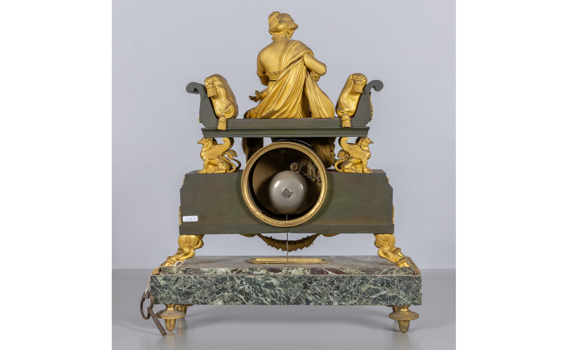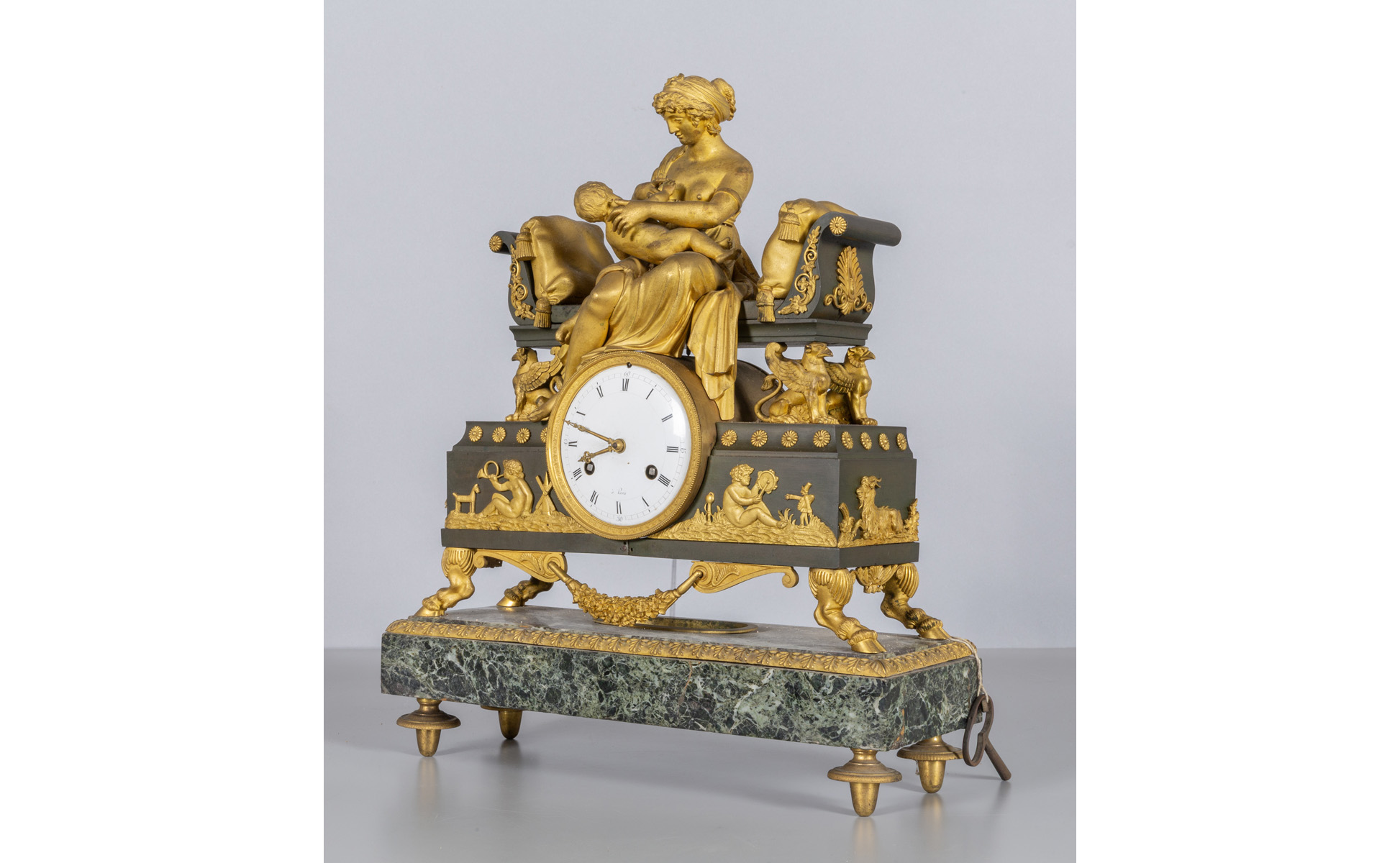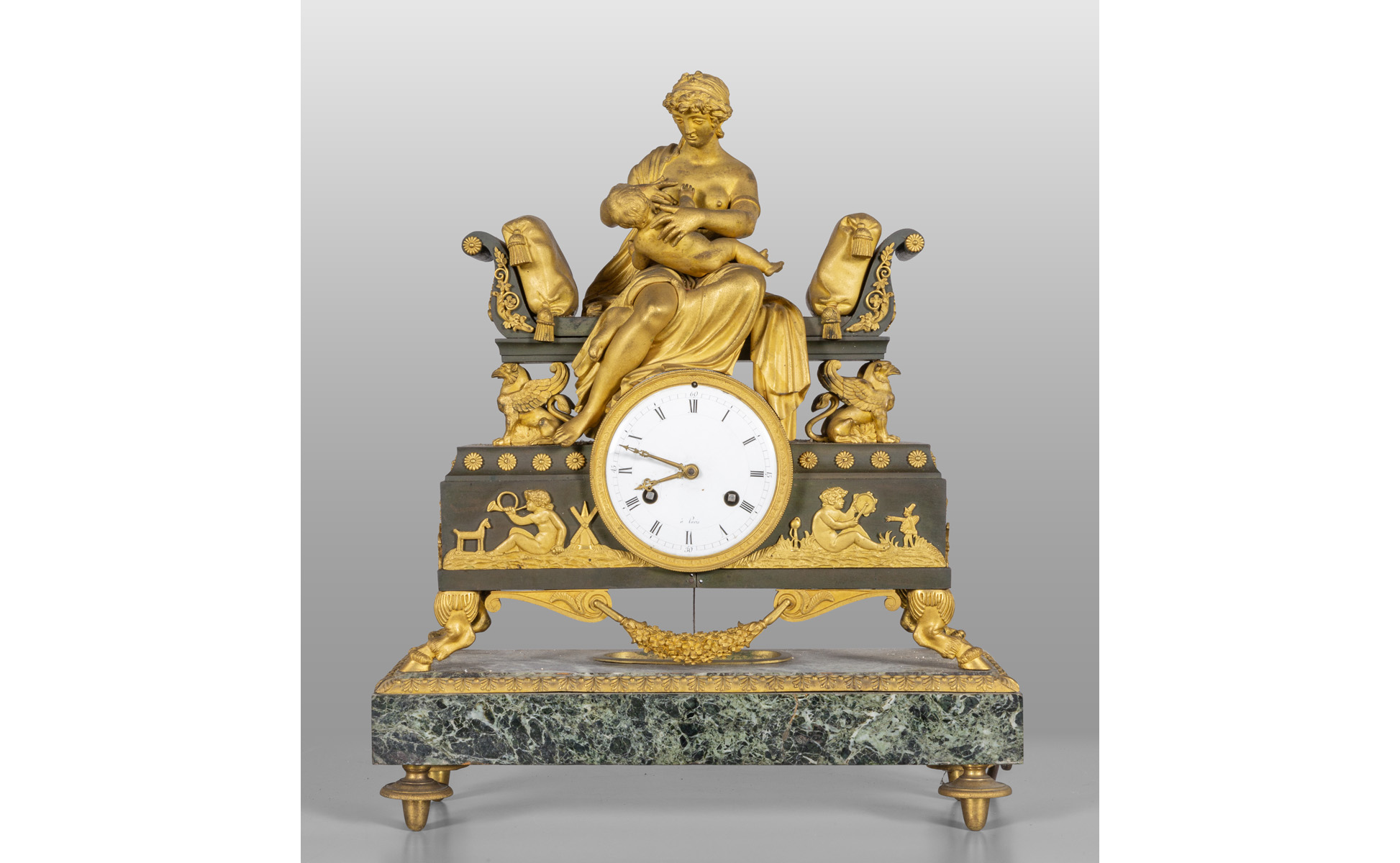 Orologio in bronzo dorato marmo e ferro nella parte superiore una giovane mamma che allatta seduta su un divano neoclassico Francia fine sec.XVIII