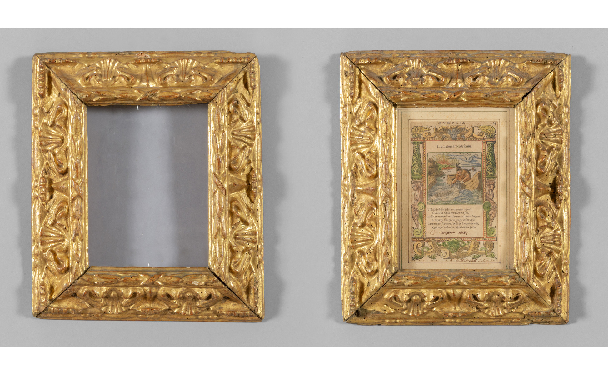 Coppia di cornici in legno intagliato e dorato Centro Italia sec.XVII