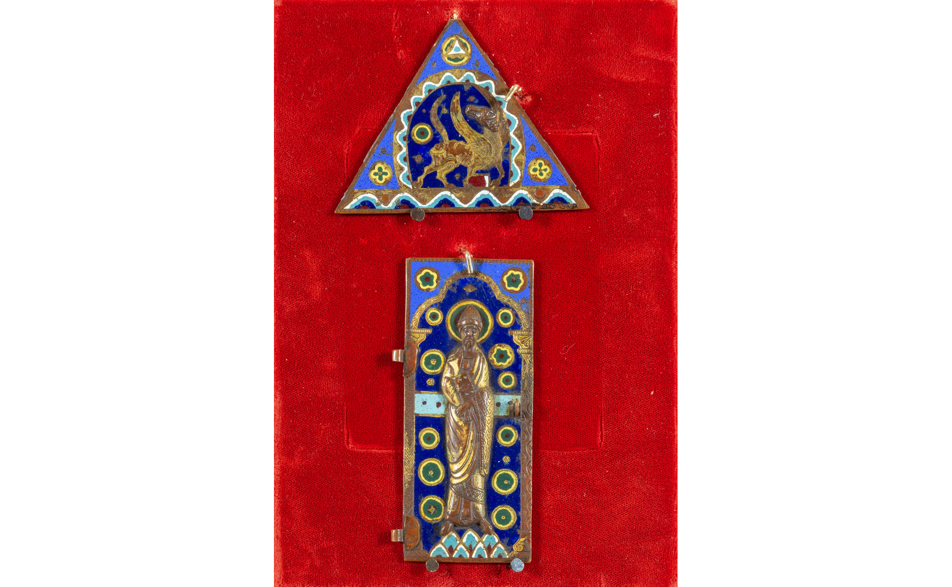 Due antichi elementi in bronzo smaltato facenti parte di una scatola uno triangolare (cm.9x7) e uno rettangolare con grifo (cm.5x11)