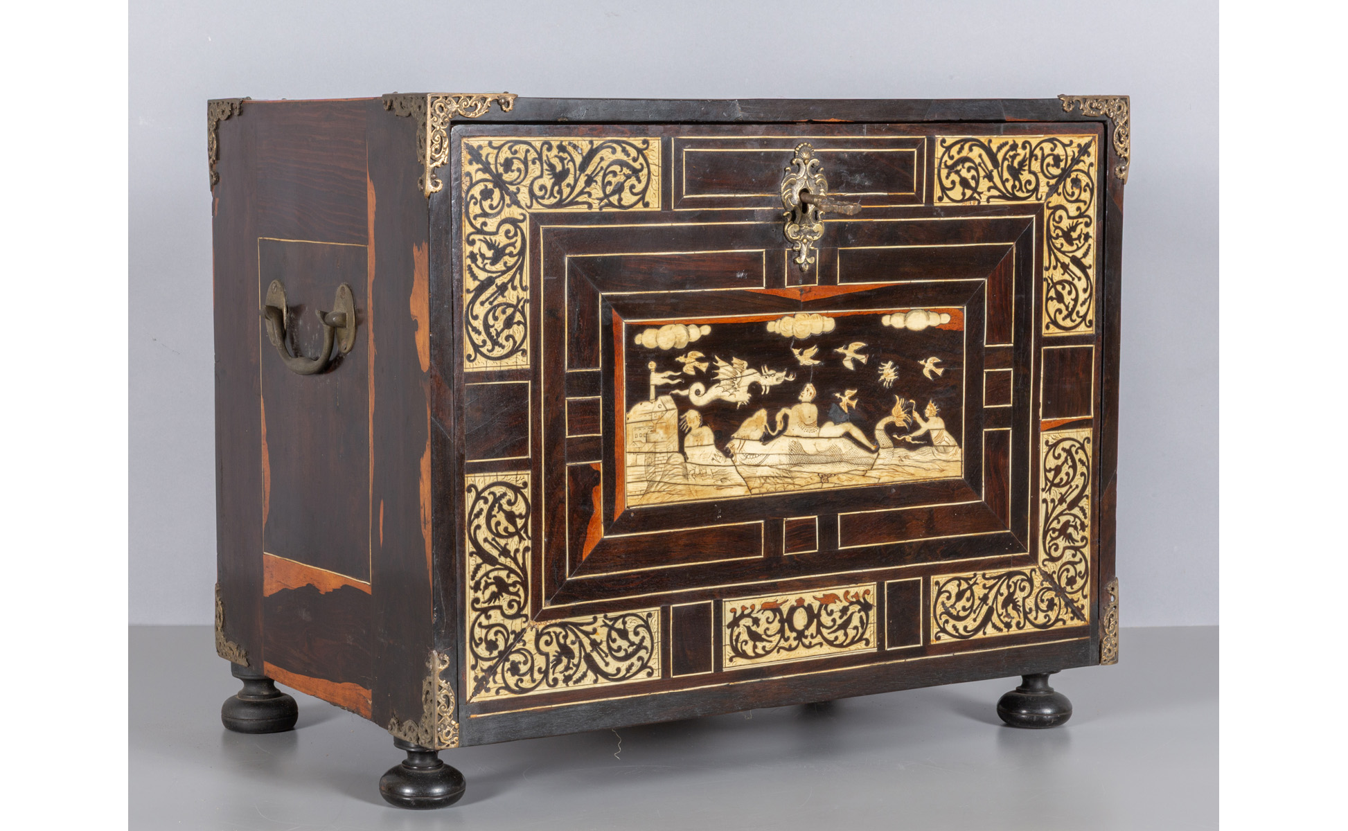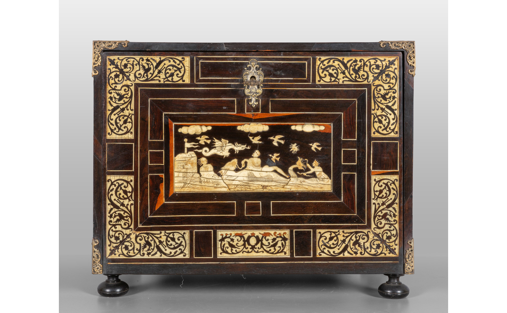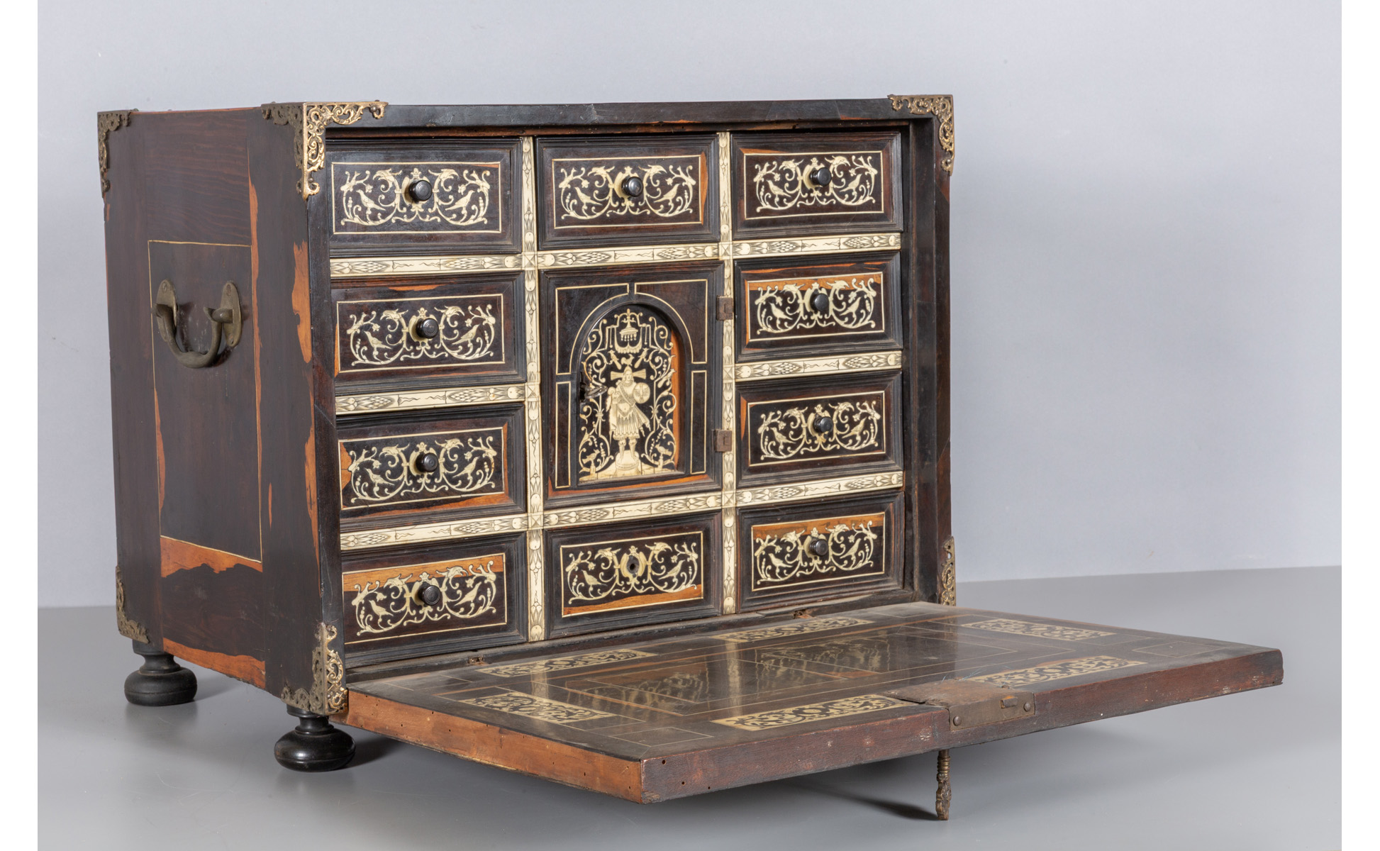 Stipo monetiere lastronato in noce d'India sportello intarsiato con grande scena centrale in avorio all'interno sette cassetti piccoli un cassetto grande ed uno sportellino finemente intarsiati in avorio con due cassetti segreti all'interno dello sportello Lombardia sec. XVIII