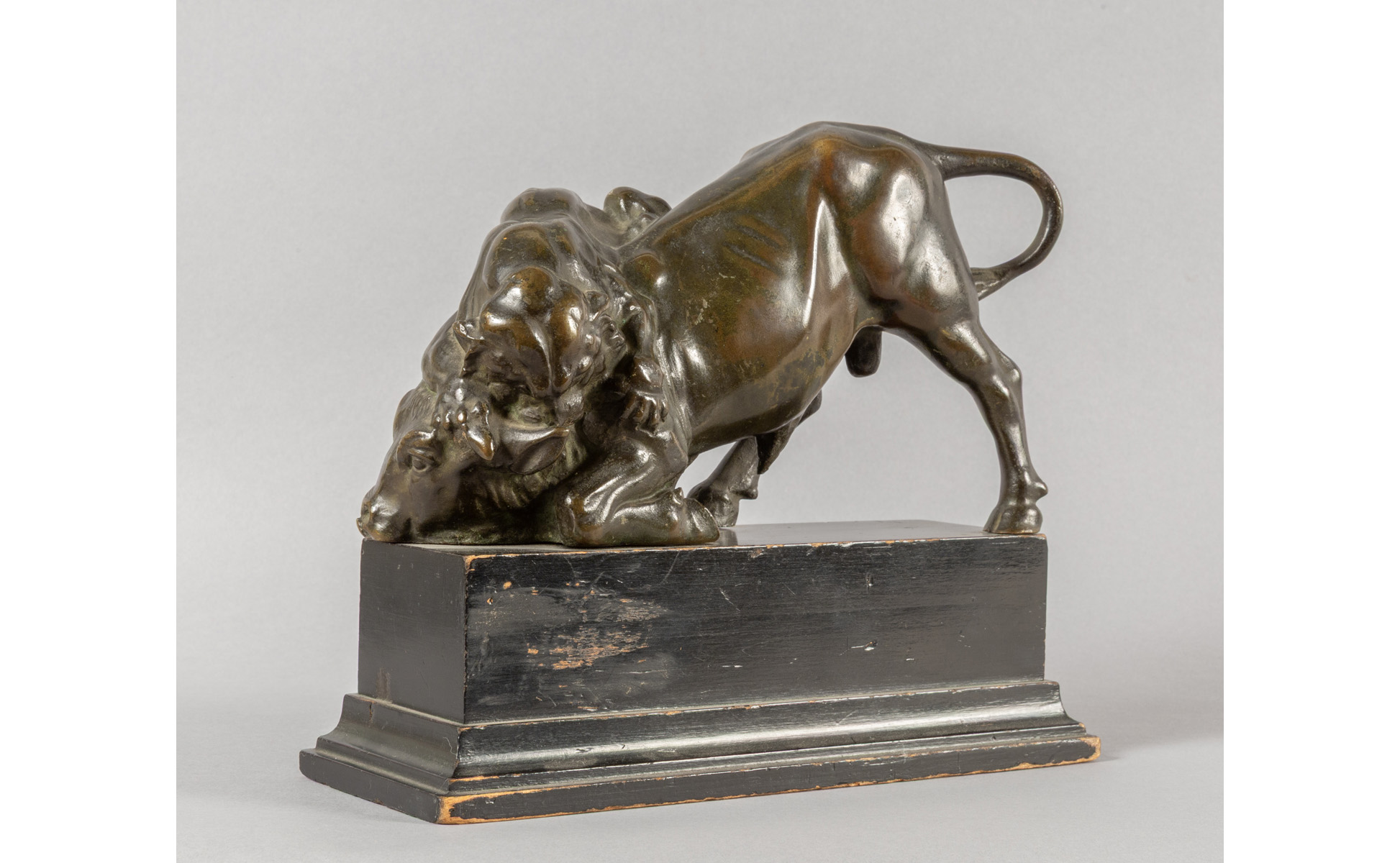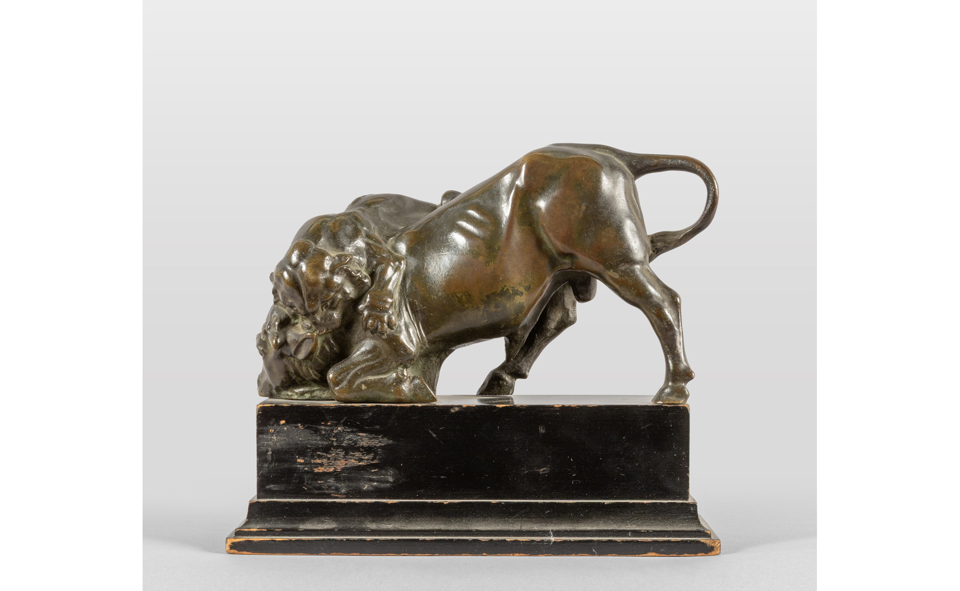 Leone che aggredisce un toro bronzo con base sec.XIX