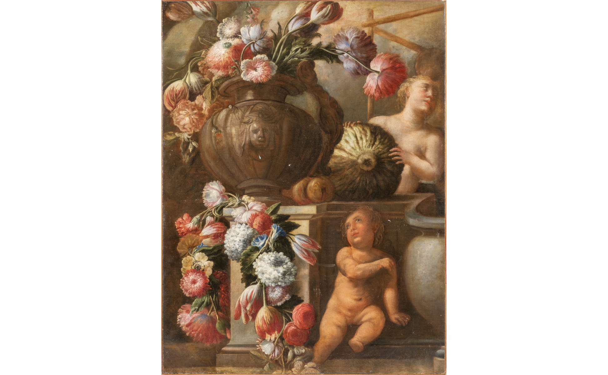Scuola romana sec.XVII 'Natura morta con putti' olio