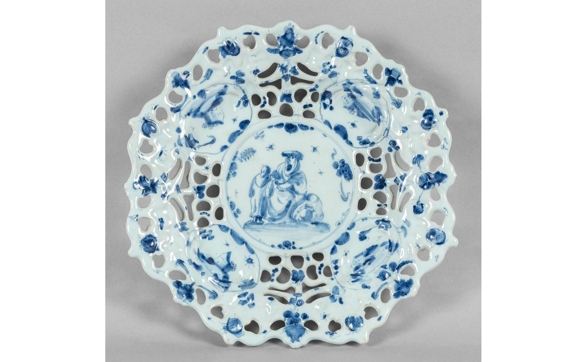 Alzata in maiolica traforata decoro con figure e riserve in un paesaggio Savona sec.XVIII