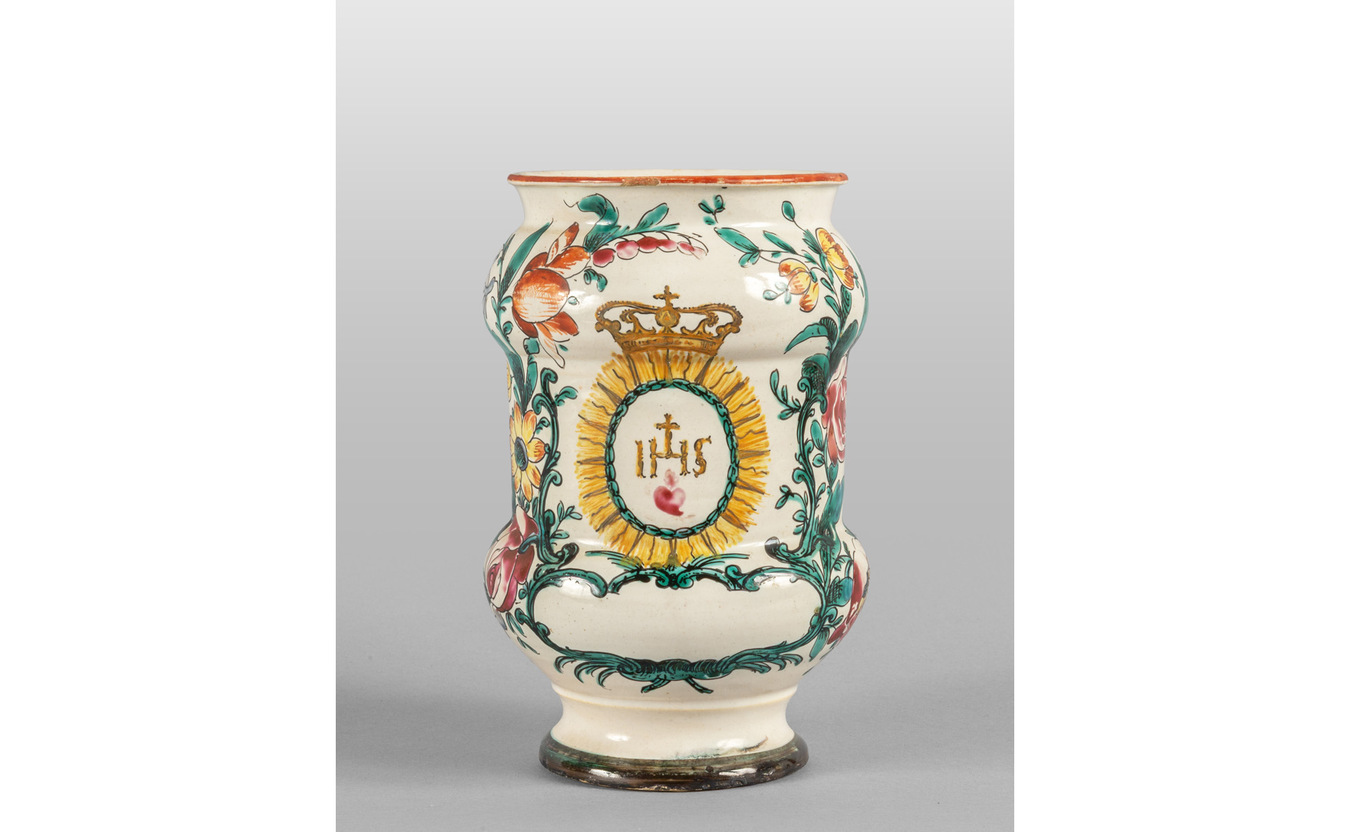 Albarello in ceramica decorato in policromia f.to Boselly Savona ultimo quarto sec.XVIII
