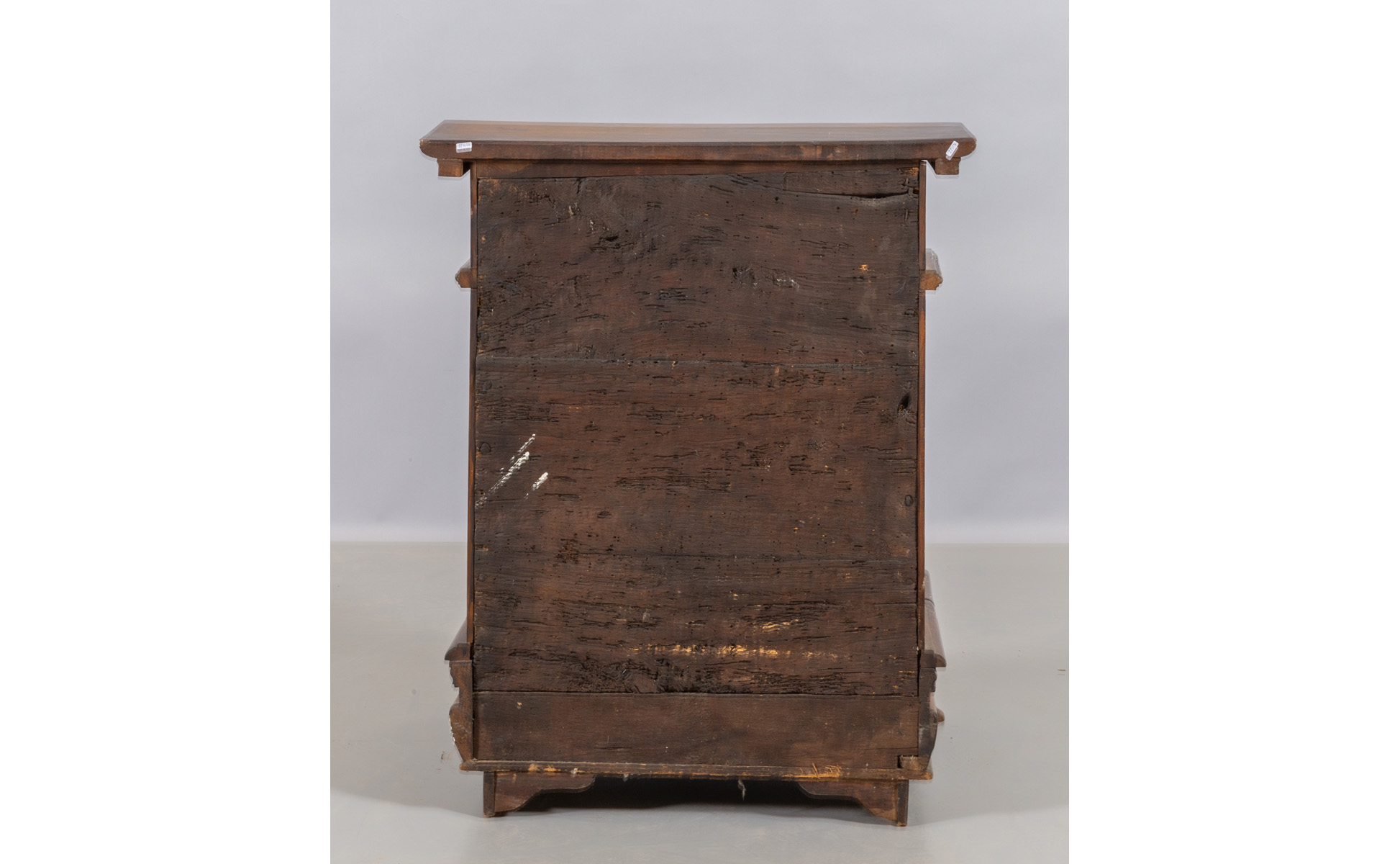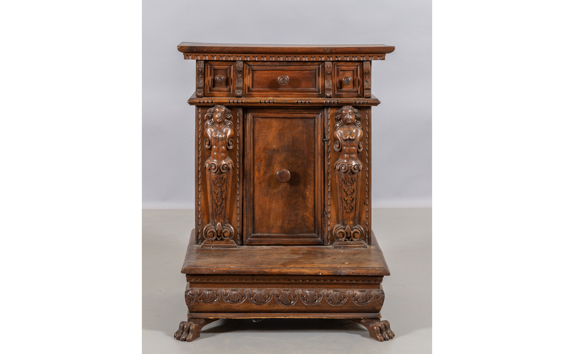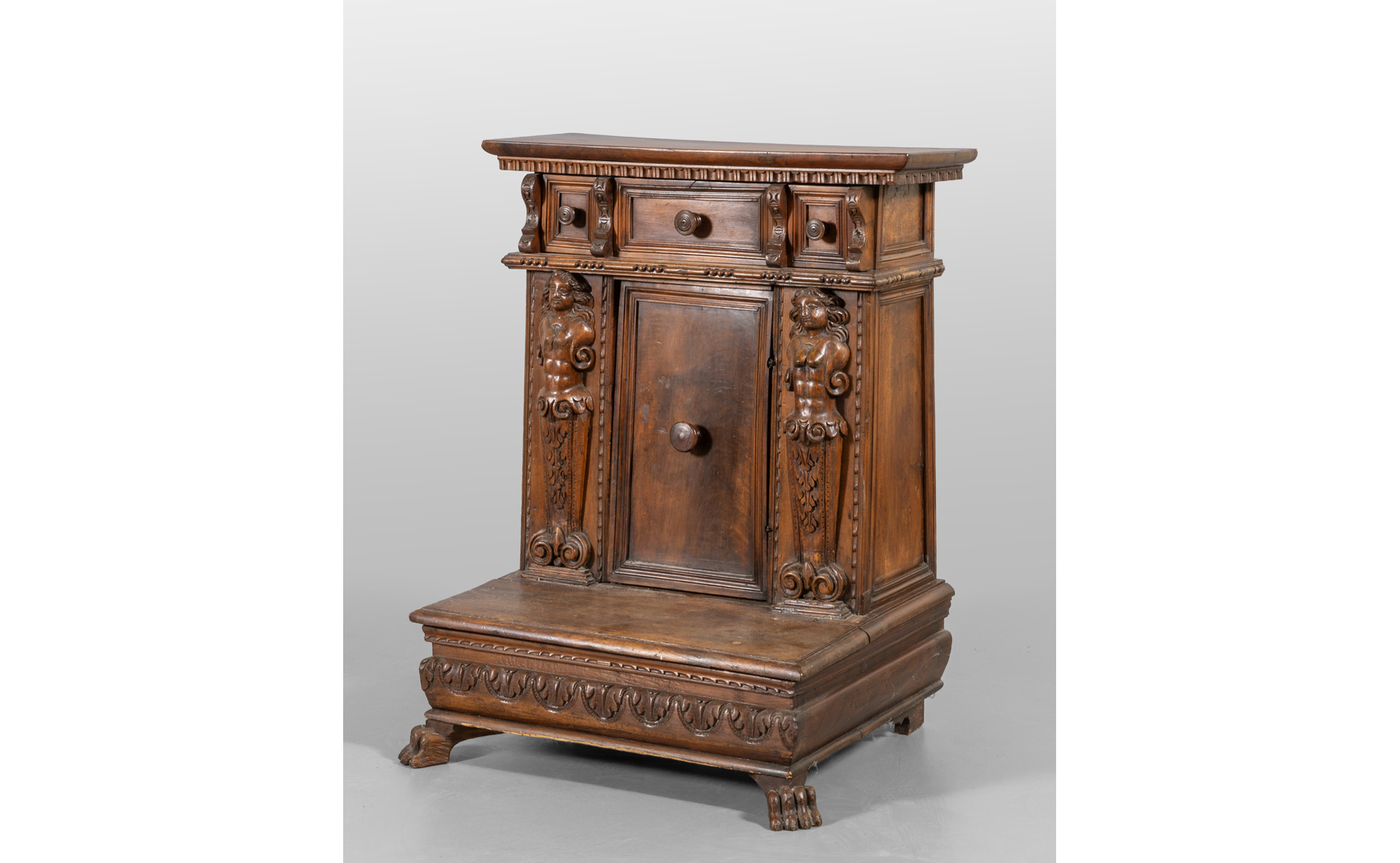 Inginocchiatoio in noce intagliato tre cassetti ed uno sportello sul fronte montante con bambocci piedi ferini Lombardia fine sec.XVII