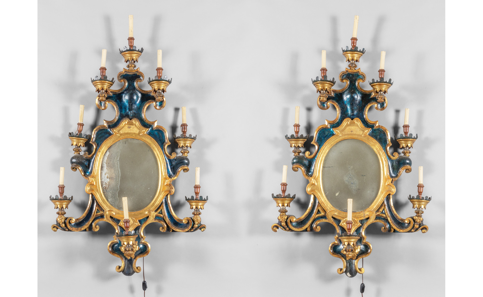25 Coppia di grandi apliques a otto luci in legno intagliato dorato e laccato a fondo blu metà sec.XVIII
