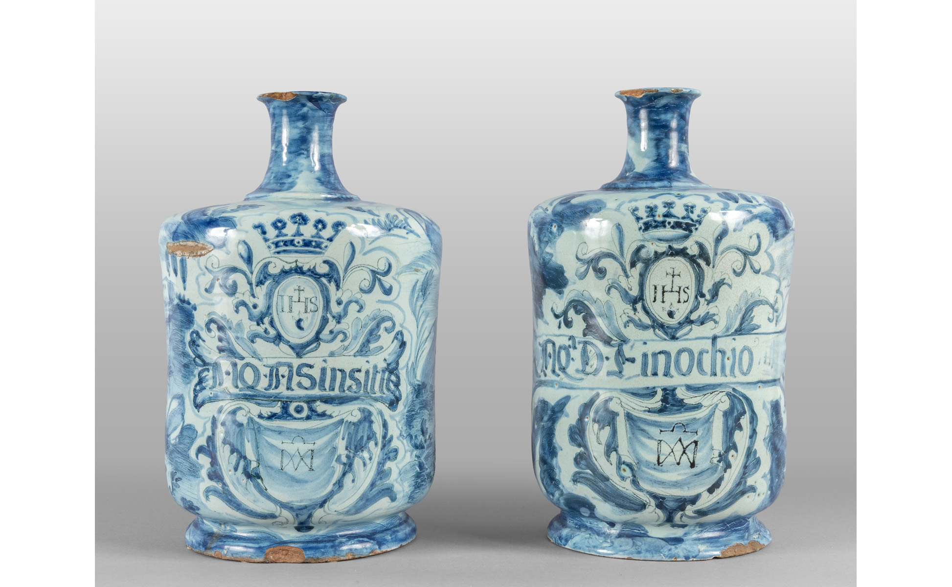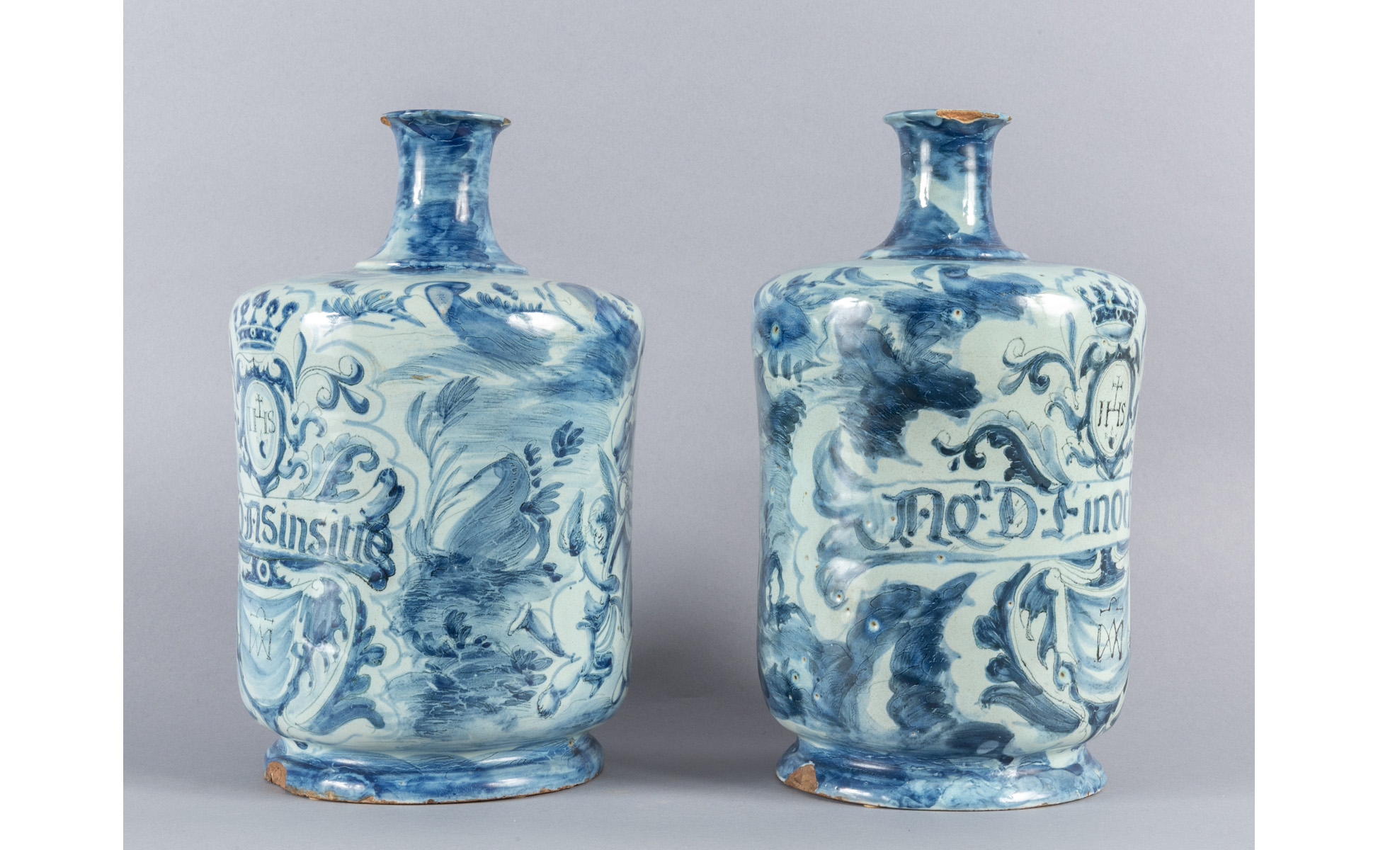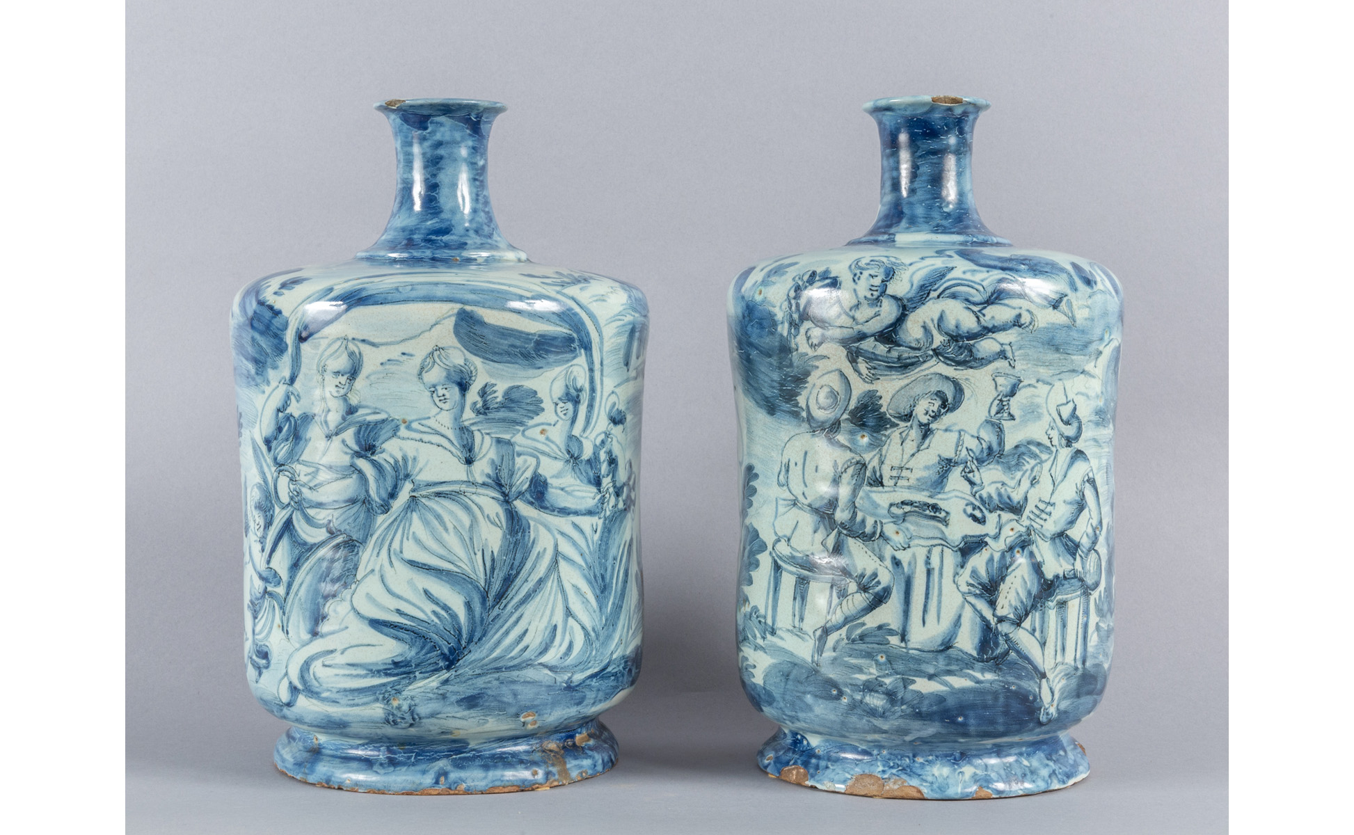 Coppia di bottiglie in maiolica decorazione bianca e blu con personaggi marca Stemma Savona sec.XVII