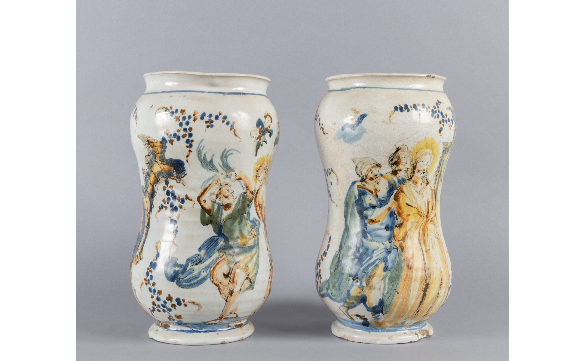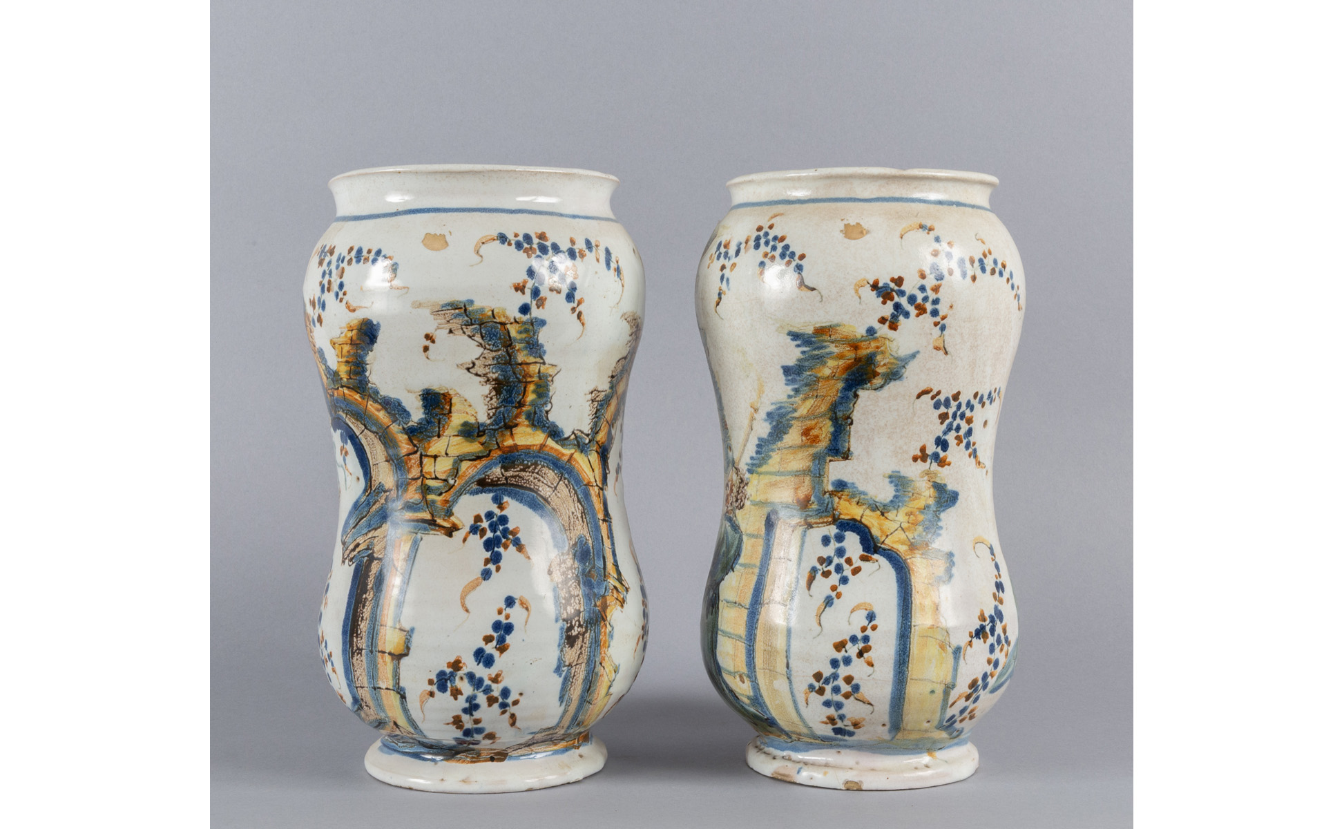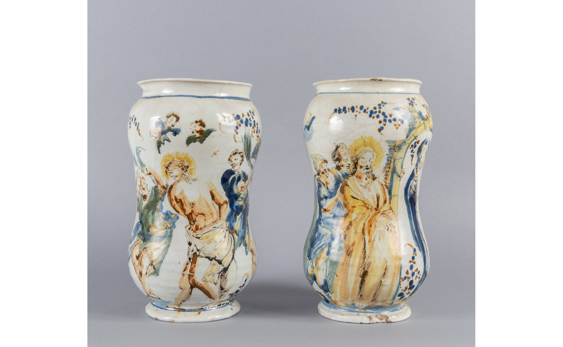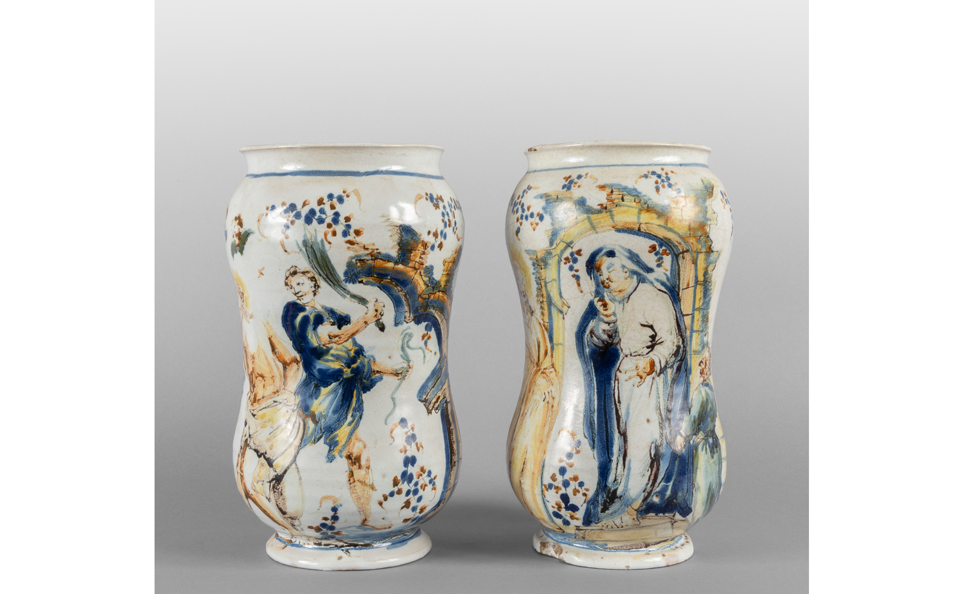 La coppia si inserisce nella produzione delle manifatture di Savona del XVIII secolo caratterizzata da una decorazione figurativa di alta qualità. L'attribuzione dei disegni ad Agostino Ratti (1699-1775) uno dei più importanti pittori e decoratori genovesi del Settecento colloca questi albarelli nell'ambito della produzione ceramica d'eccellenza della Repubblica di Genova.