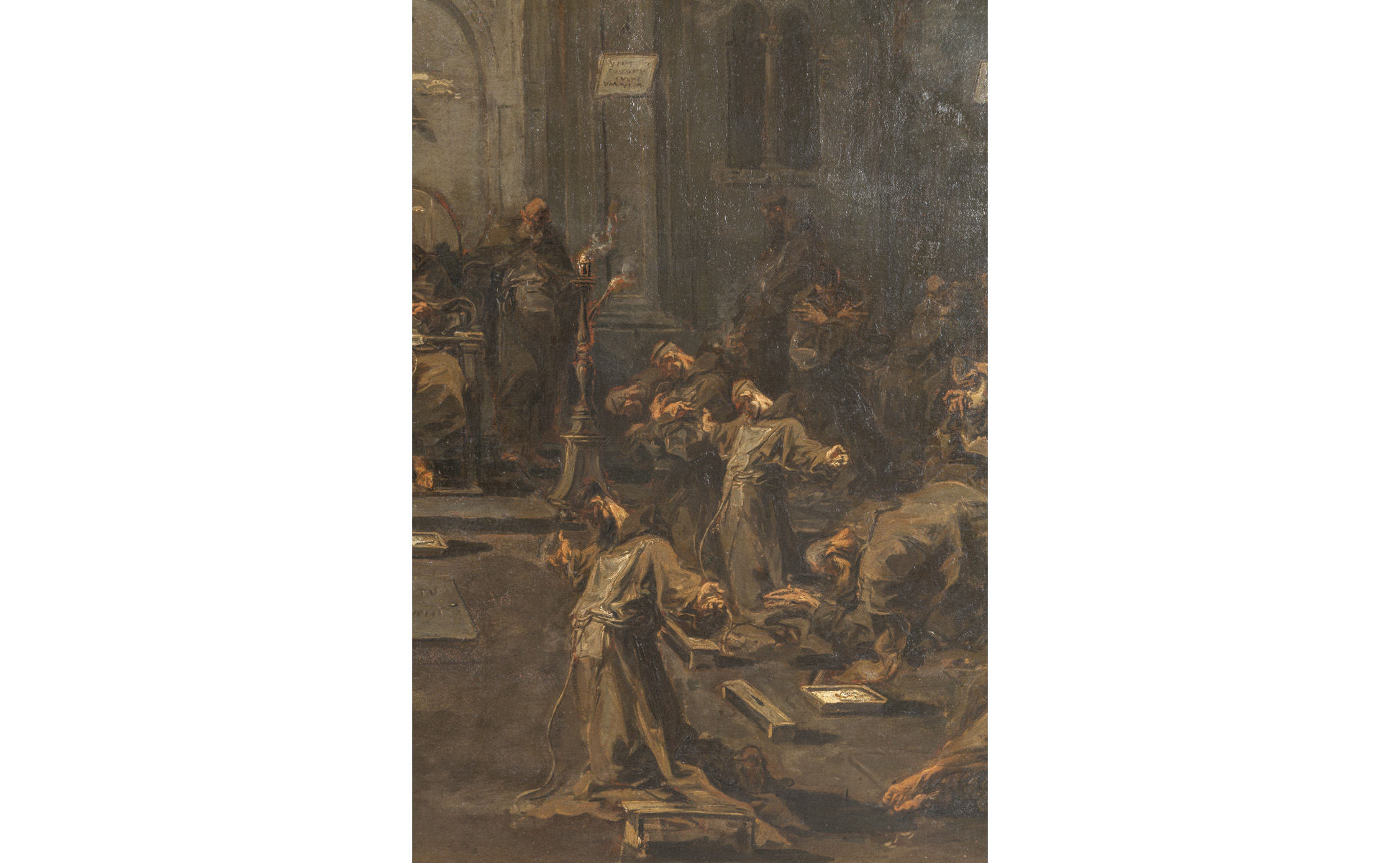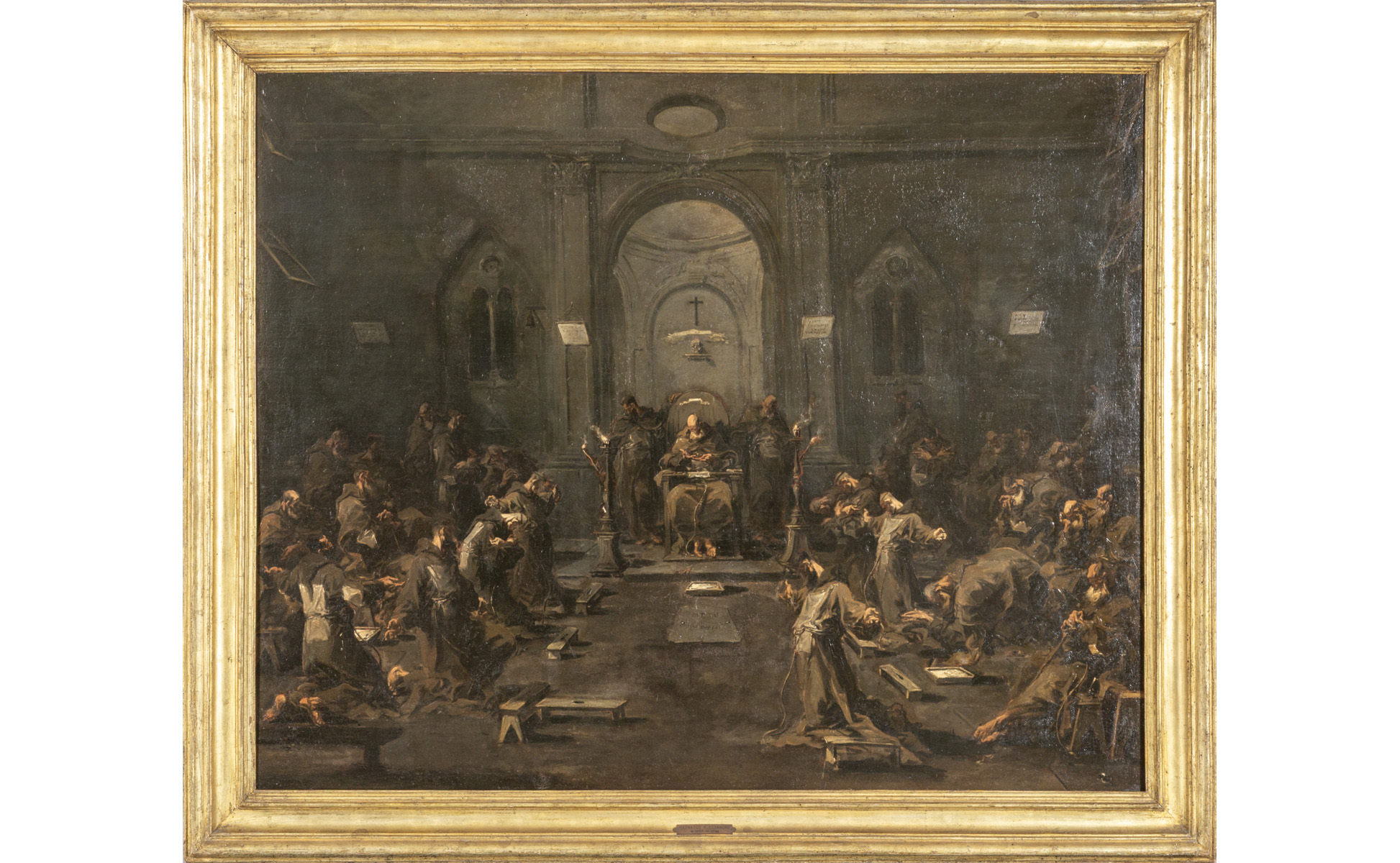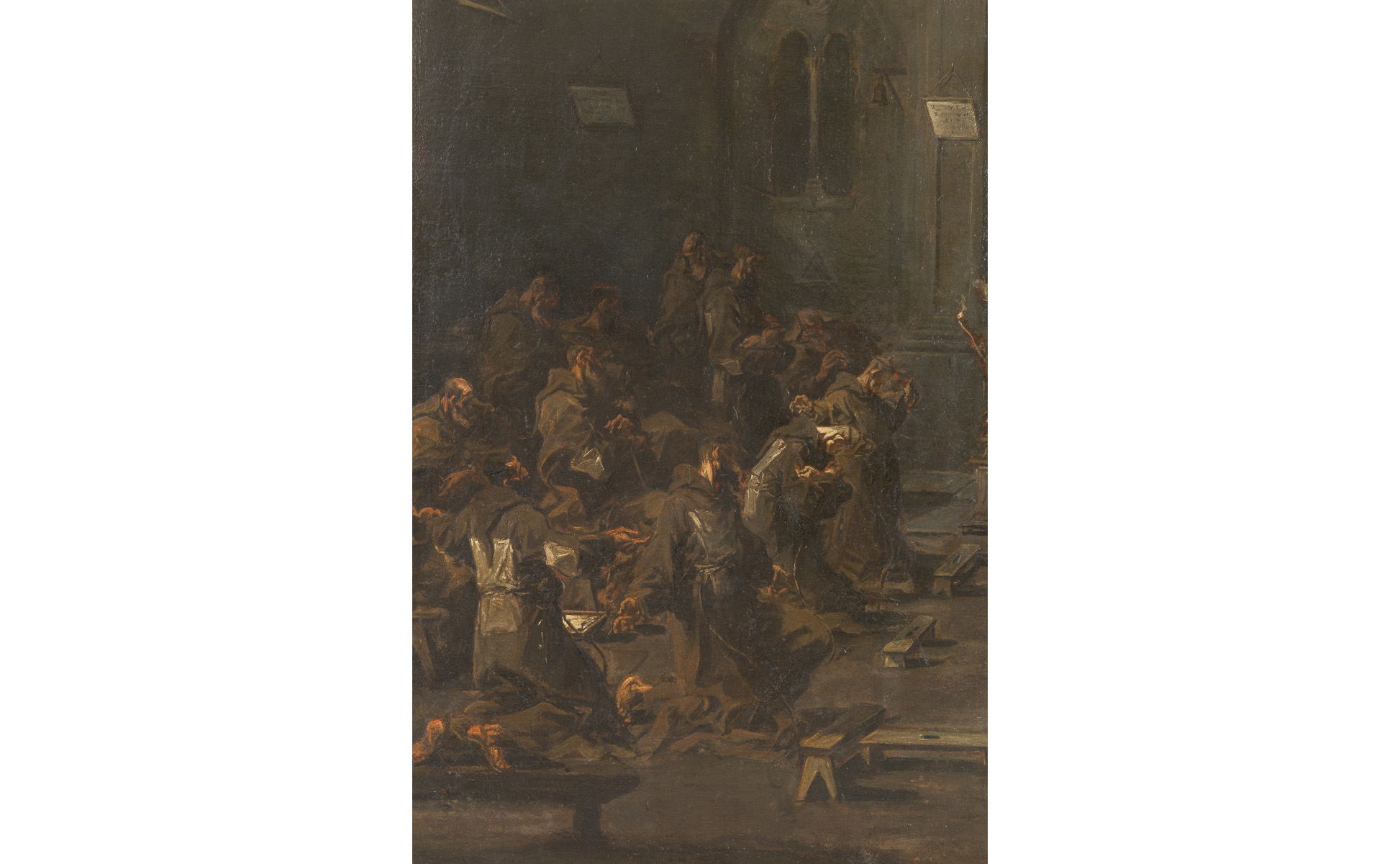 Opera di notevole qualità e dimensioni che rappresenta una vivace scena di vita monastica all'interno di un refettorio conventuale. La composizione si articola in un'architettura ecclesiastica caratterizzata da archi gotici nicchie laterali con figure di santi e un'abside centrale dominata da una croce. Al centro della scena sopraelevato su una pedana un monaco legge dal pulpito durante il pasto comunitario mentre numerosi confratelli disposti su più livelli sono intenti nelle loro attività quotidiane: alcuni siedono ai tavoli consumando il pasto altri si muovono nello spazio con grande dinamismo.