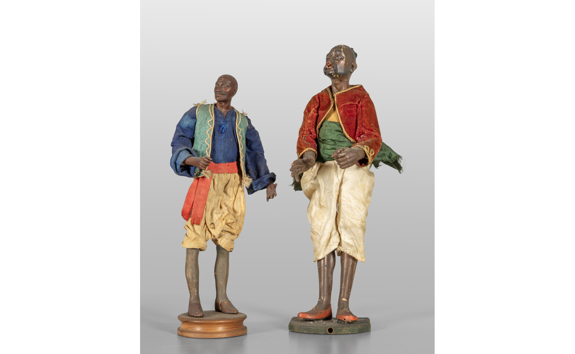 Moretti due sculture con teste in terracotta policroma mani e piedi in legno policromo occhi in vetro abiti in seta Napoli sec.XVIII