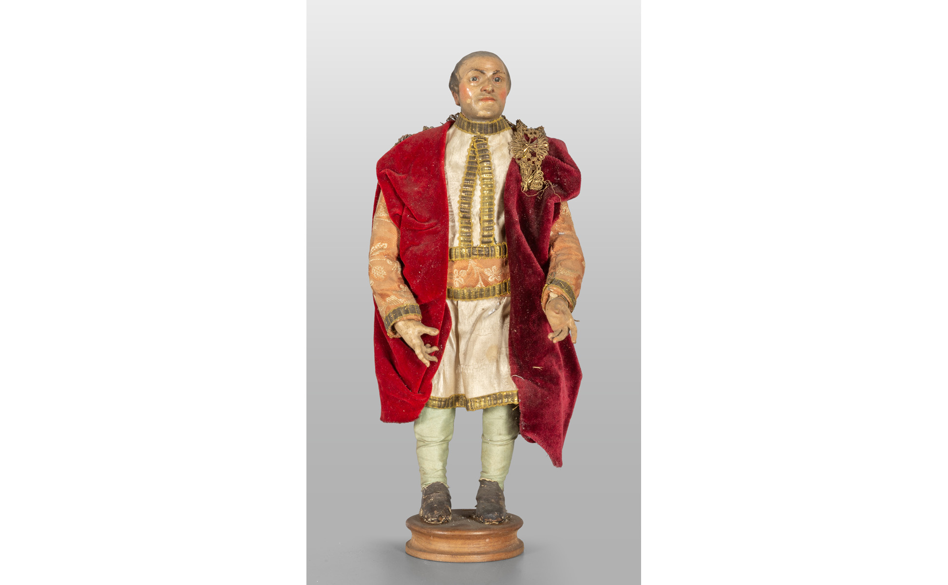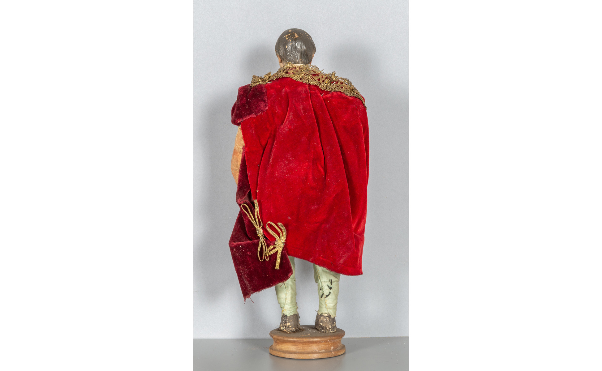 Gentiluomo con mantella in velluto rosso testa in terracotta policroma mani e piedi in legno policromo occhi in vetro Napoli sec.XVIII
