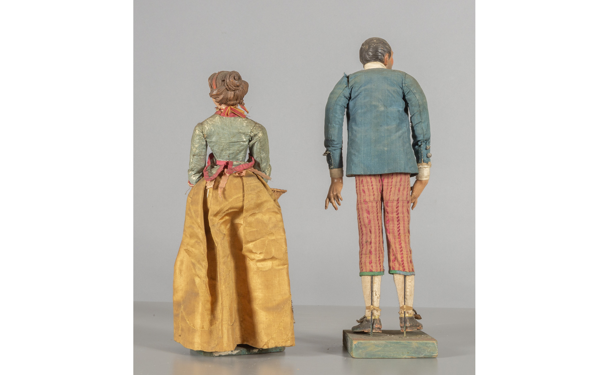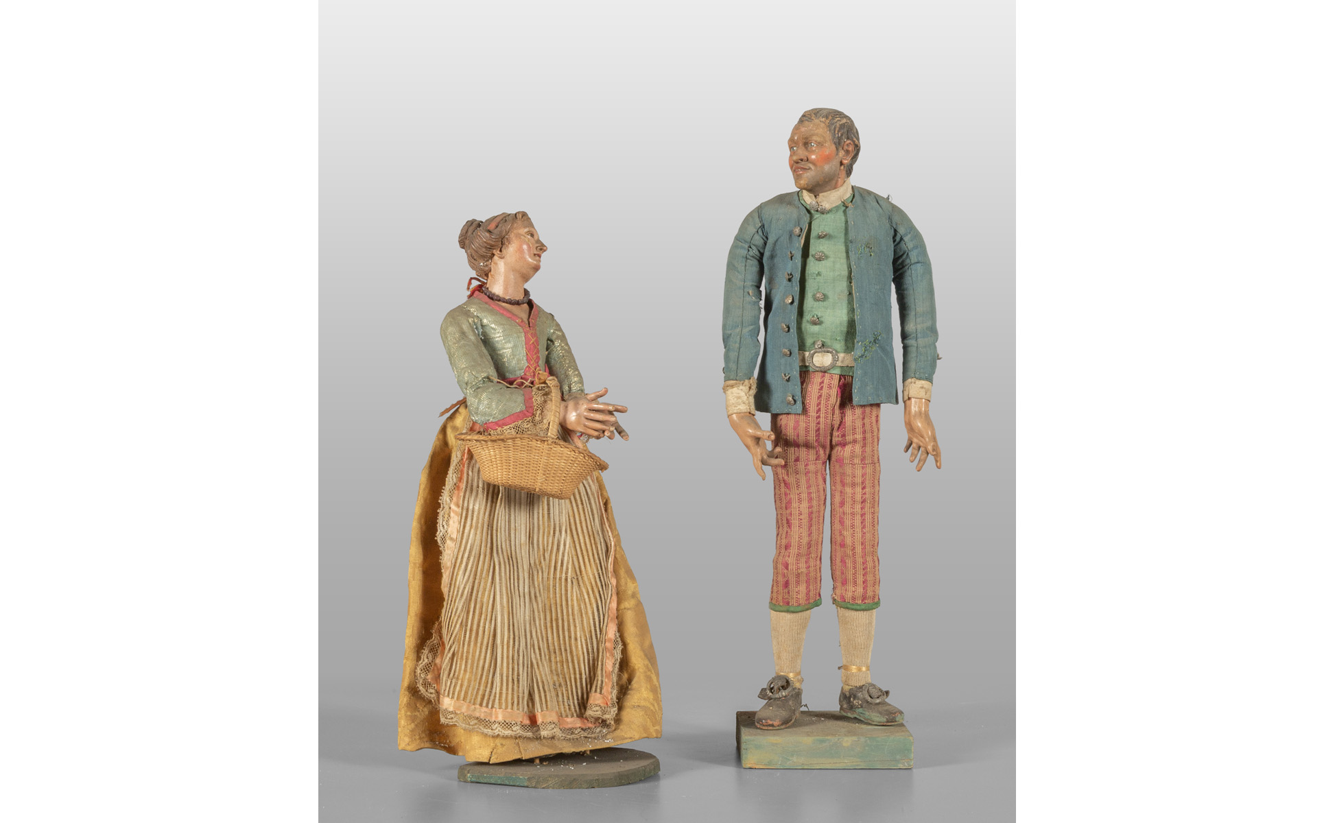 Due figurine sculture con teste in terracotta policroma mani e piedi in legno policromo occhi in vetro abiti in seta Napoli sec.XVIII