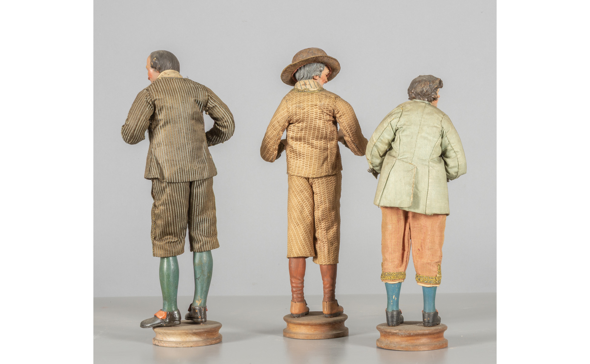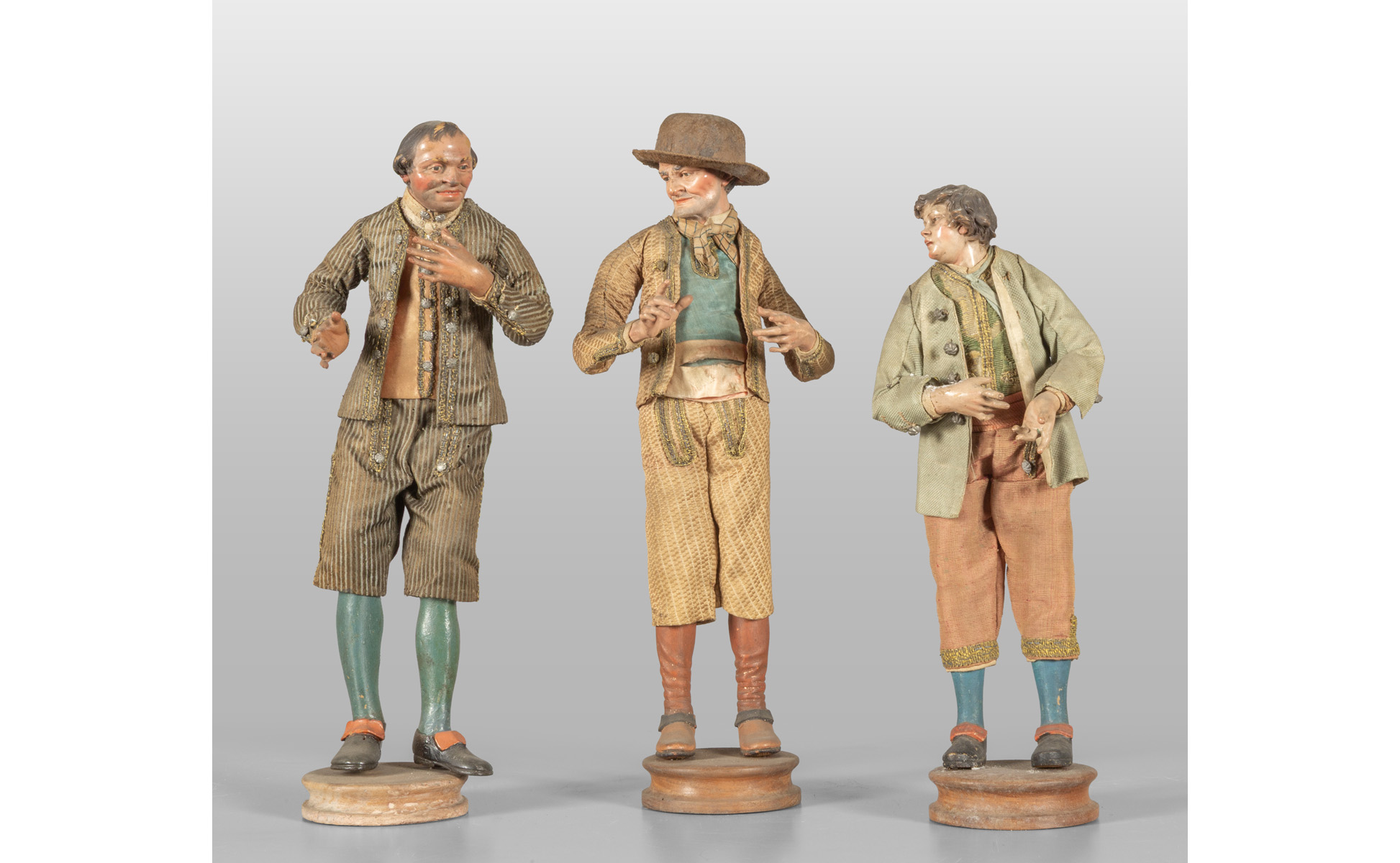 Tre statuine di cui una con cappello teste in terracotta policroma mani e piedi in legno policromo occhi in vetro abiti in seta Napoli sec.XVIII