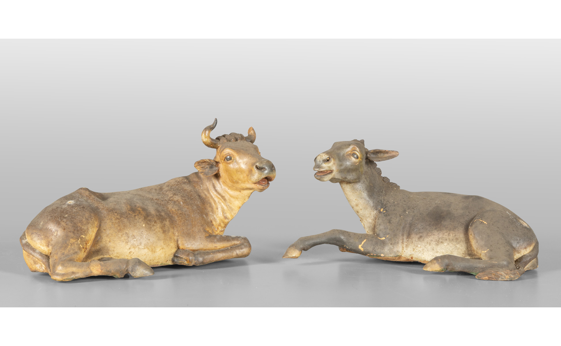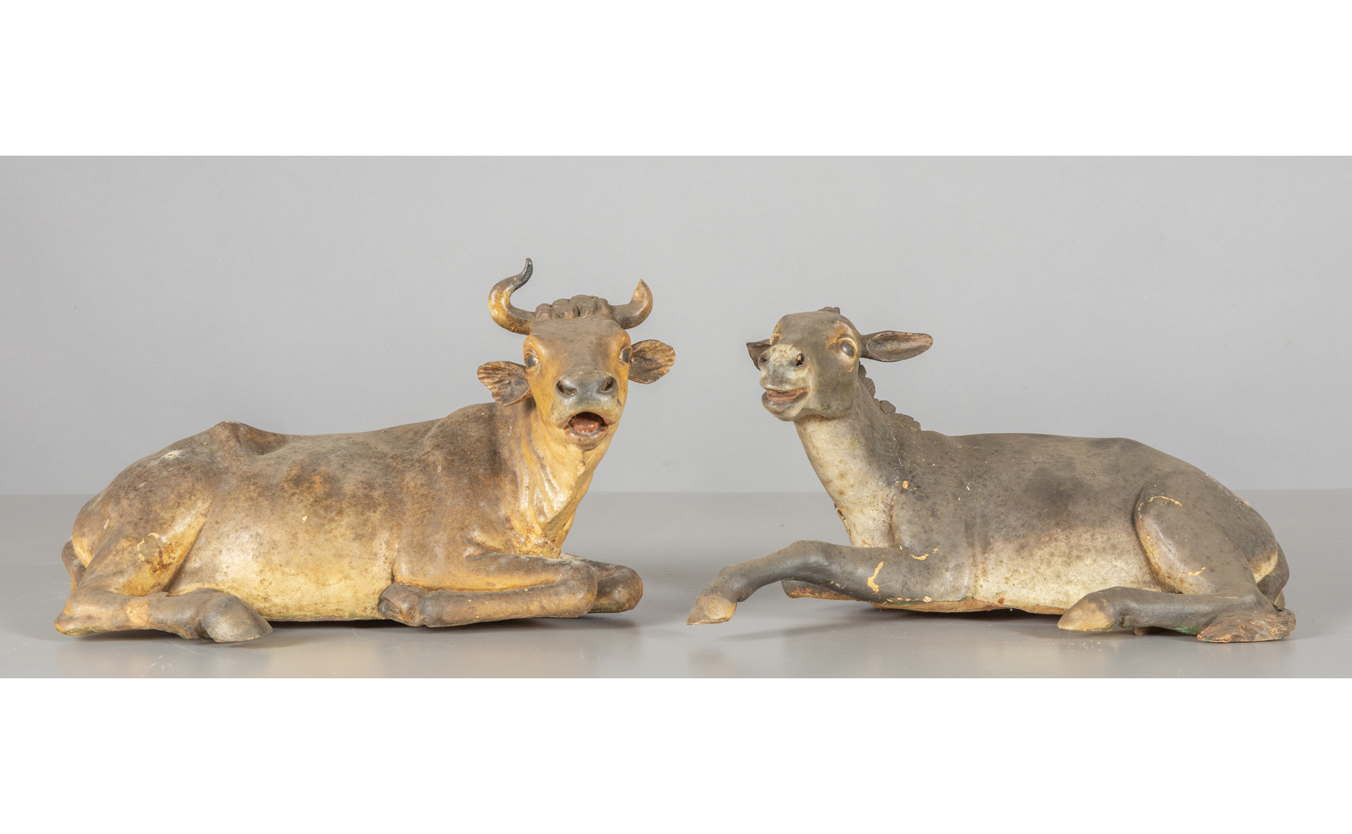 Mucca e asino sdraiati due sculture in legno policromo con occhi di vetro Napoli sec.XVIII