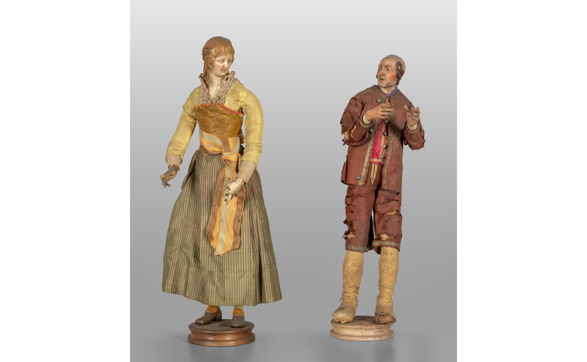 Contadini due sculture con teste in terracotta policroma mani e piedi in legno policromo occhi in vetro abiti in seta Napoli sec.XVIII
