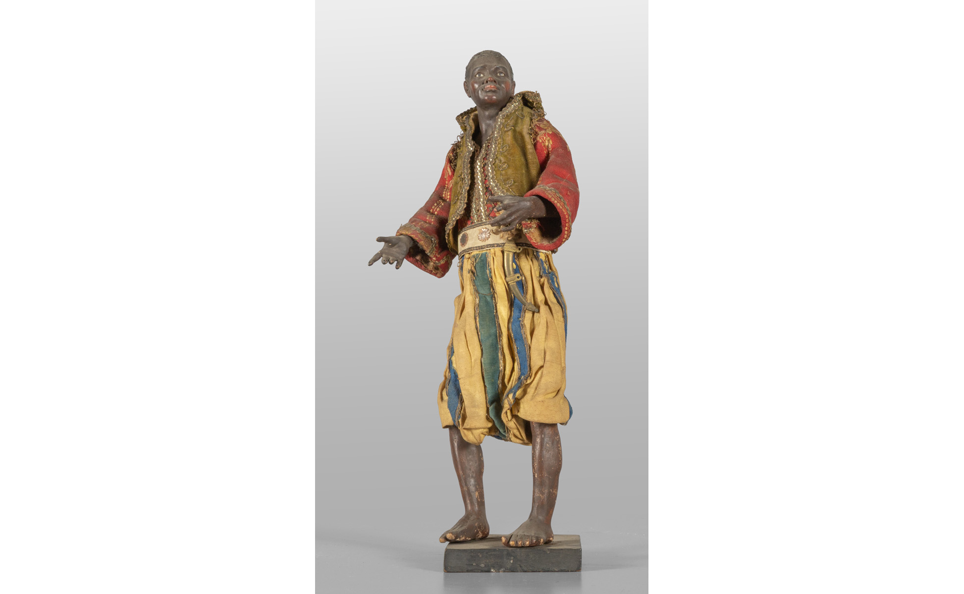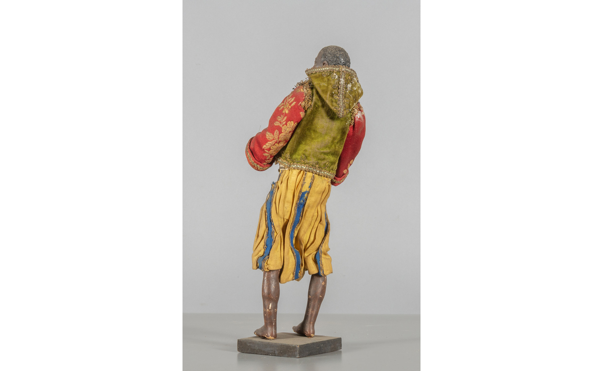 Moretto con gilet rosso testa in terracotta policroma mani e piedi in legno policromo occhi in vetro abiti in seta Napoli sec.XVIII