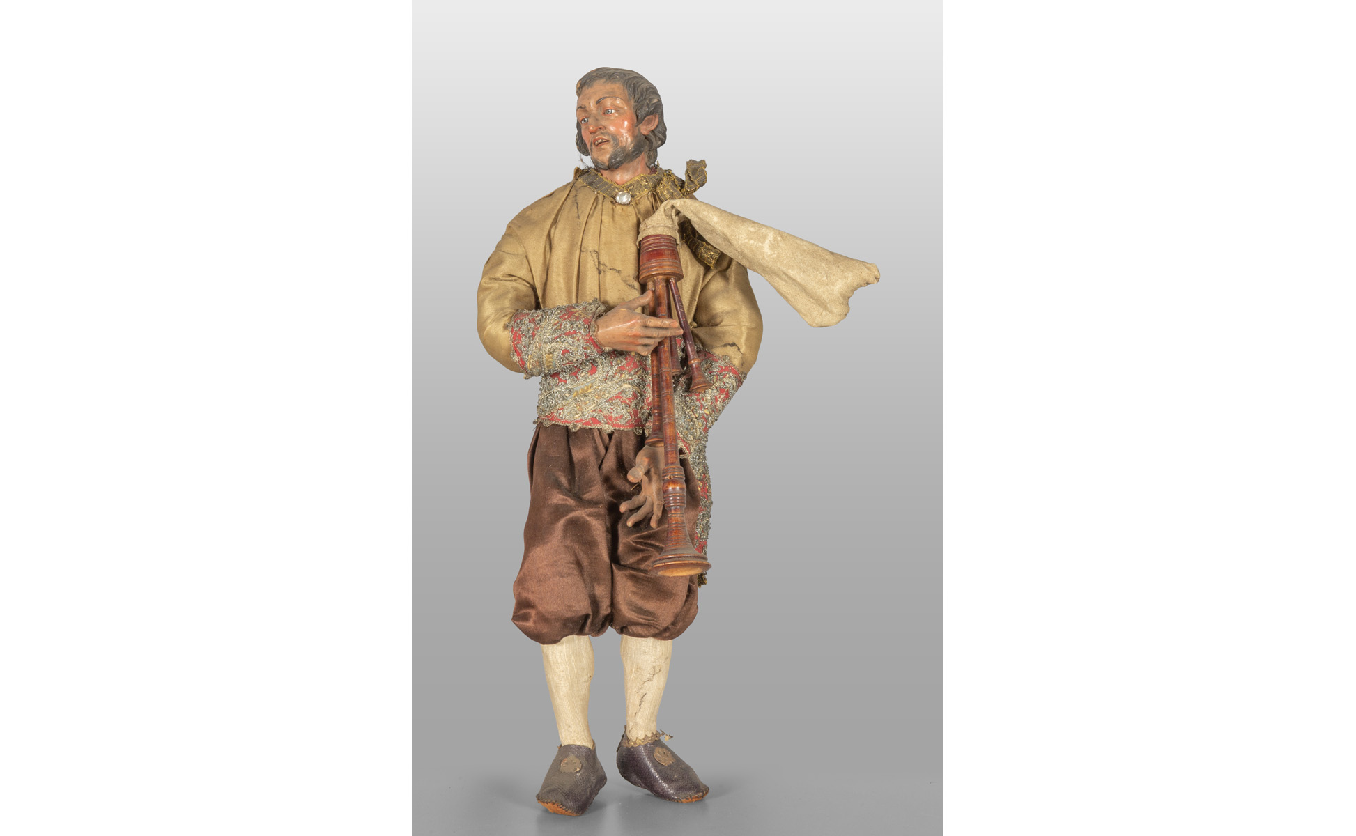 Suonatore di cornamusa scultura con testa in terracotta policroma mani e piedi in legno policromo occhi in vetro abiti in seta Napoli sec.XVIII