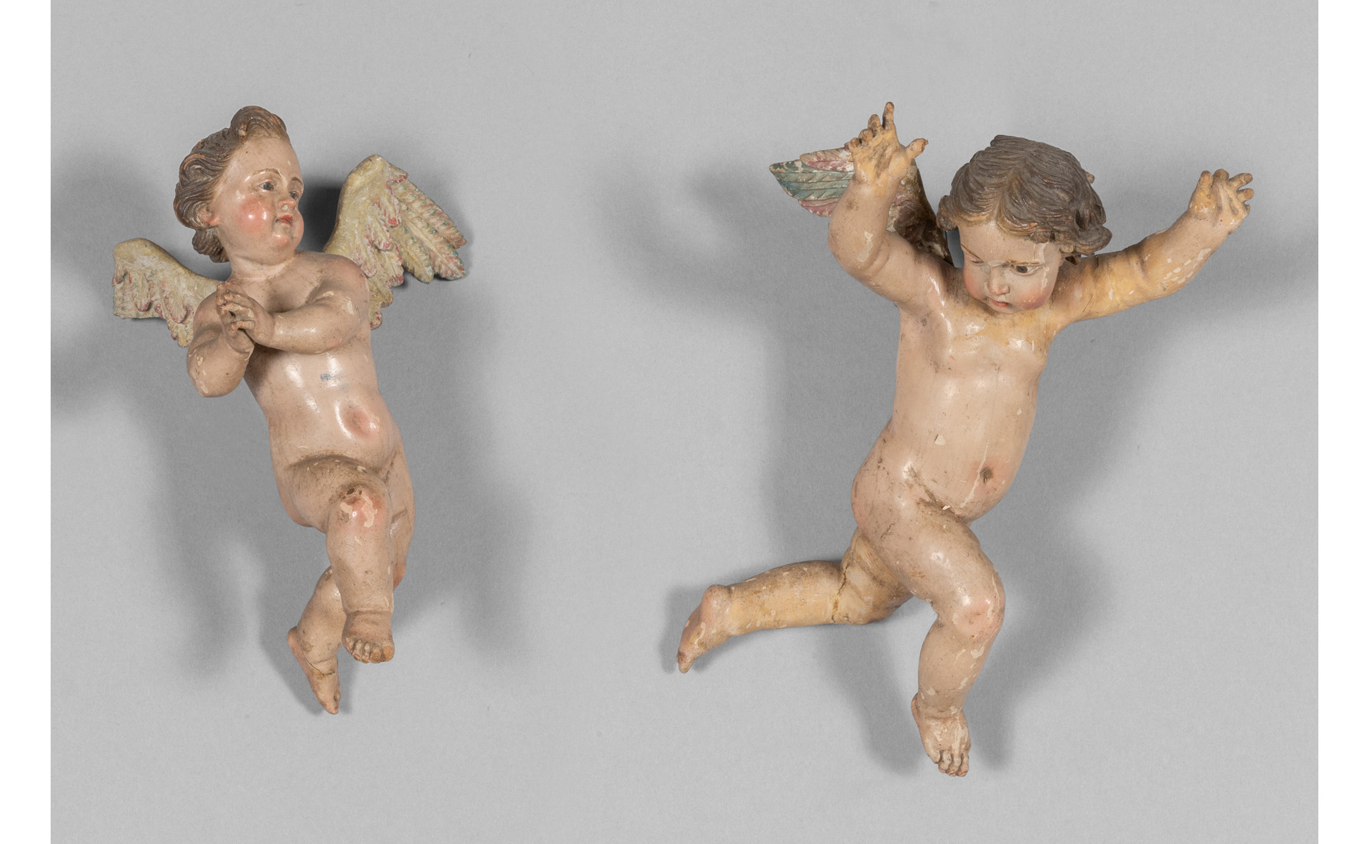 Coppia di angioletti volanti teste in terracotta policroma mani e piedi in legno policromo occhi in vetro Napoli sec.XVIII