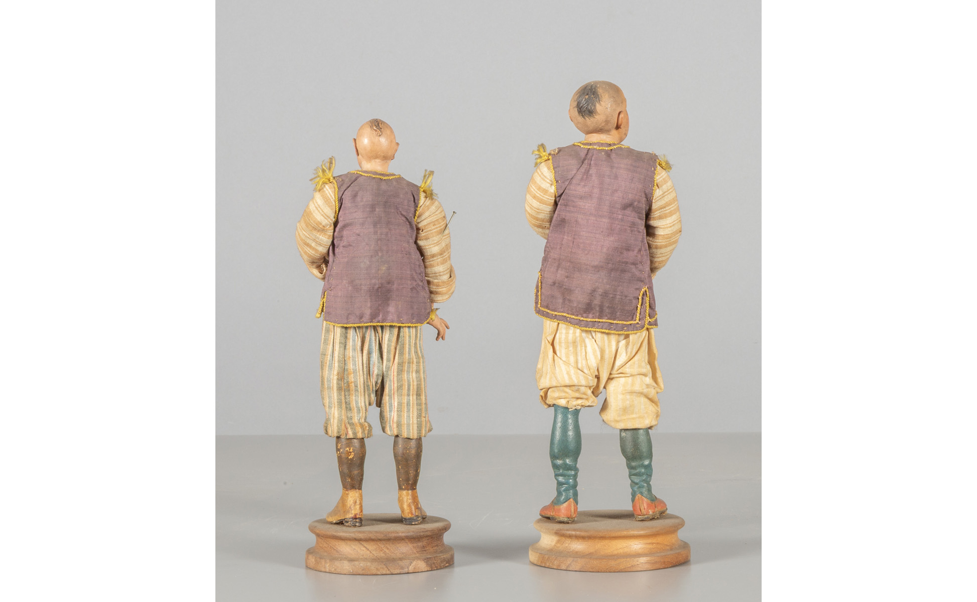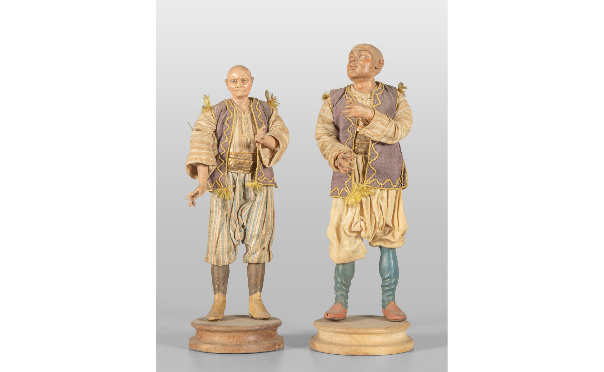 Coppia di orientali teste in terracotta policroma mani e piedi in legno policromo occhi in vetro abiti in seta Napoli sec.XVIII