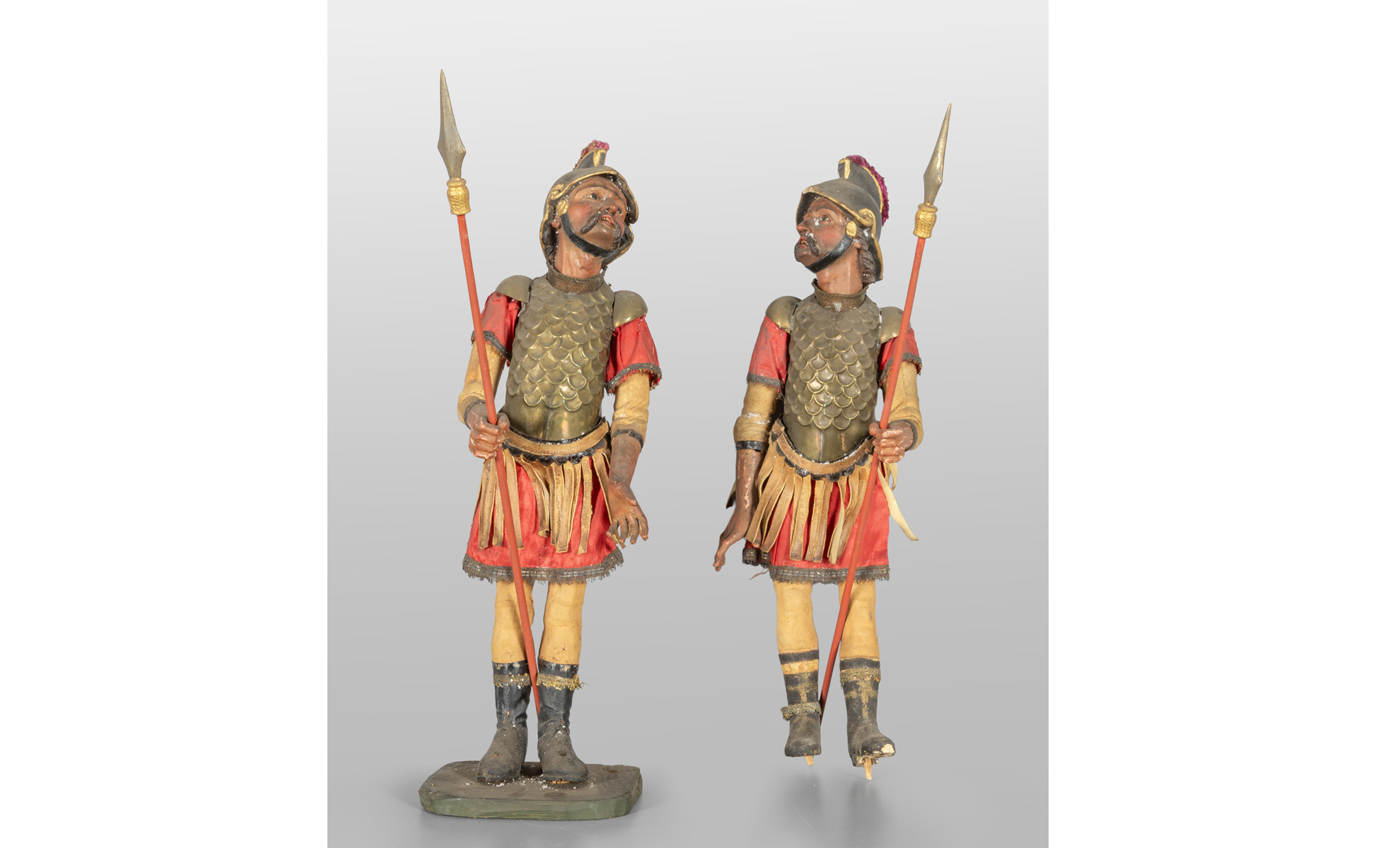 Coppia di corazzieri con lancia due sculture con teste in terracotta policroma mani e piedi in legno policromo occhi in vetro abiti in seta Napoli sec.XVIII