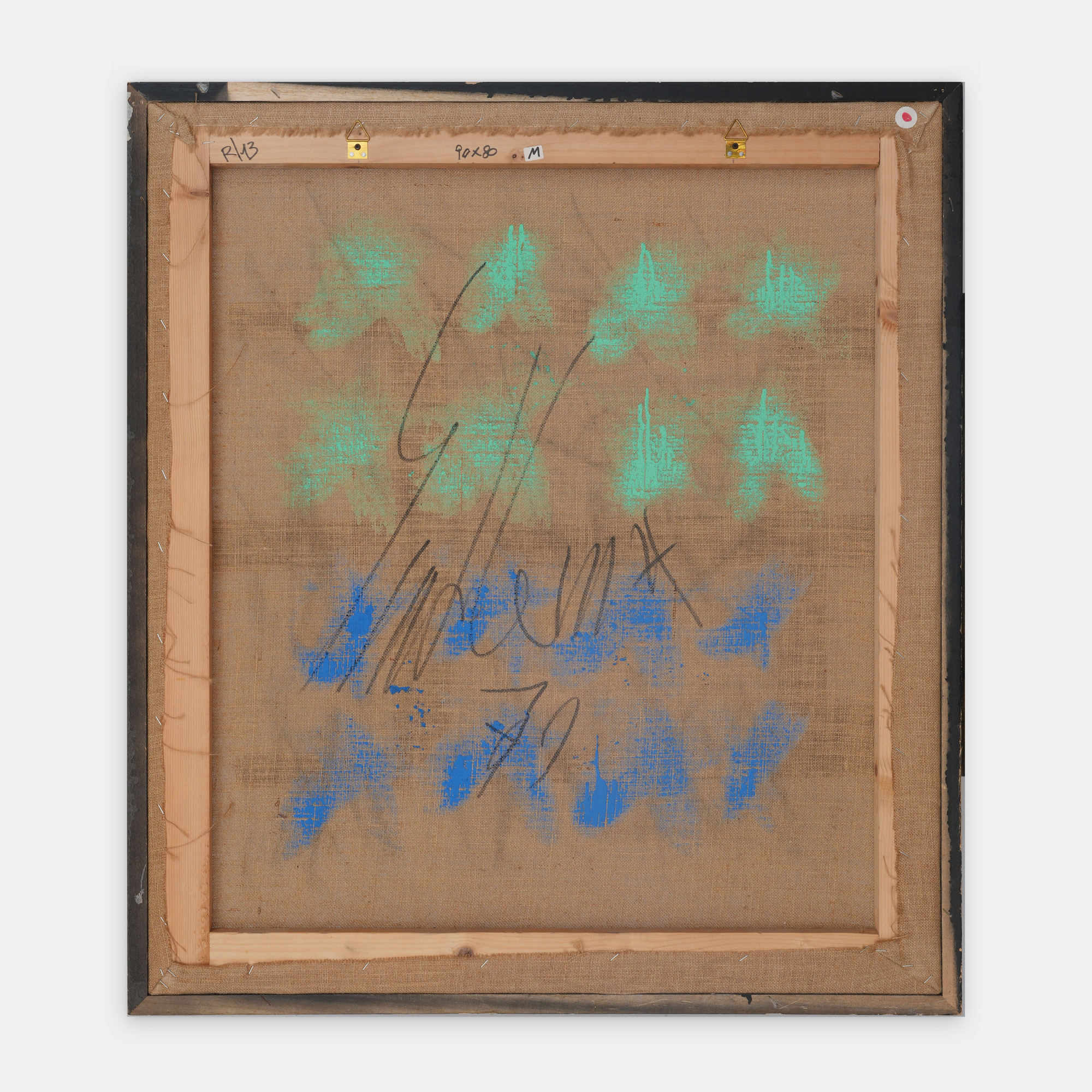 L’opera è eseguita su tela di juta ed è in complessivo buono stato di conservazione. L’osservazione diretta in luce naturale non evidenzia irregolarità superficiali; la materia pittorica risulta stabile e ben aderente al supporto, che appare correttamente tensionato. Il telaio è in buone condizioni strutturali. L’indagine condotta in luce ultravioletta non rileva fenomeni di fluorescenza né interventi di restauro riconoscibili.