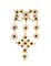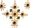 Modello di spillo sardo in oro 18k a forma di fiocco, con elementi pendenti floreali e croce latina centrale, lavorati a traforo e con piccoli elementi decorativi in filigrana, decorati con paste vitree verdi e rosse.