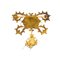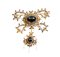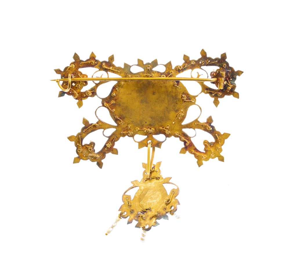 Modello di spillo sardo a forma di fiocco, in oro, decorato con motivi floreali e impreziosito con cornice in micro perle e due granati in taglio cabochon di forma ovale e forma rotonda posti al centro.