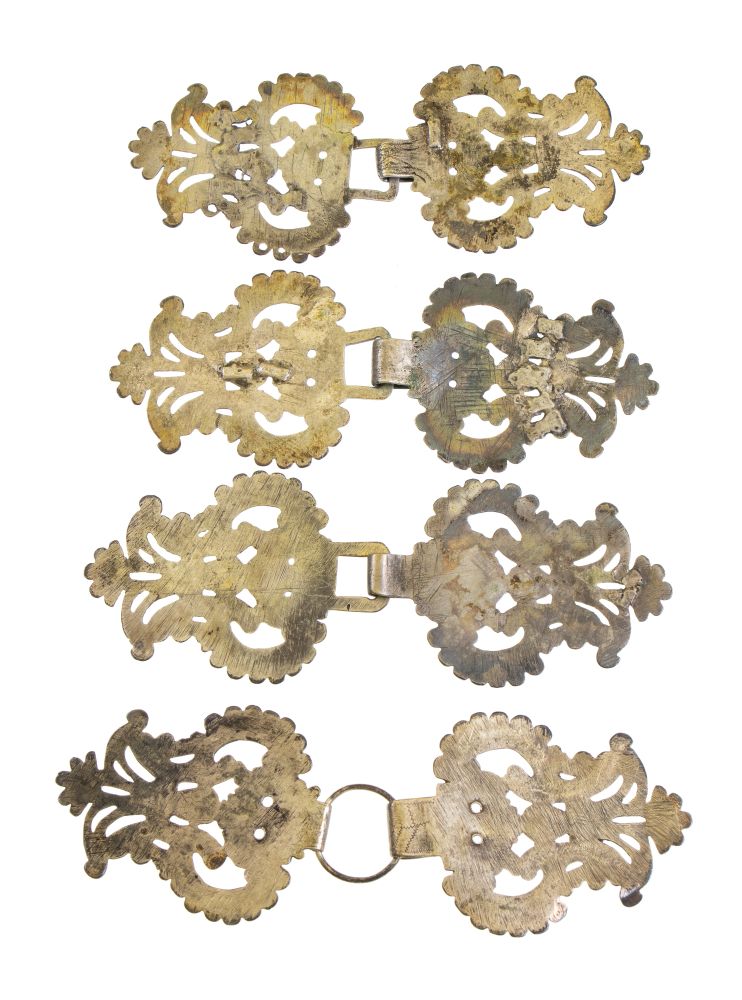 aventi una struttura composta da una serie di placche e ganci articolati, impreziositi da ricchi motivi floreali. Al centro delle singole sezioni emergono imponenti mascheroni stilizzati. Destinati a impreziosire i corsetti, le gancere erano un vero gioiello identitario, espressione di status, tipicamente usati tra il XVI e il XIX secolo.