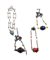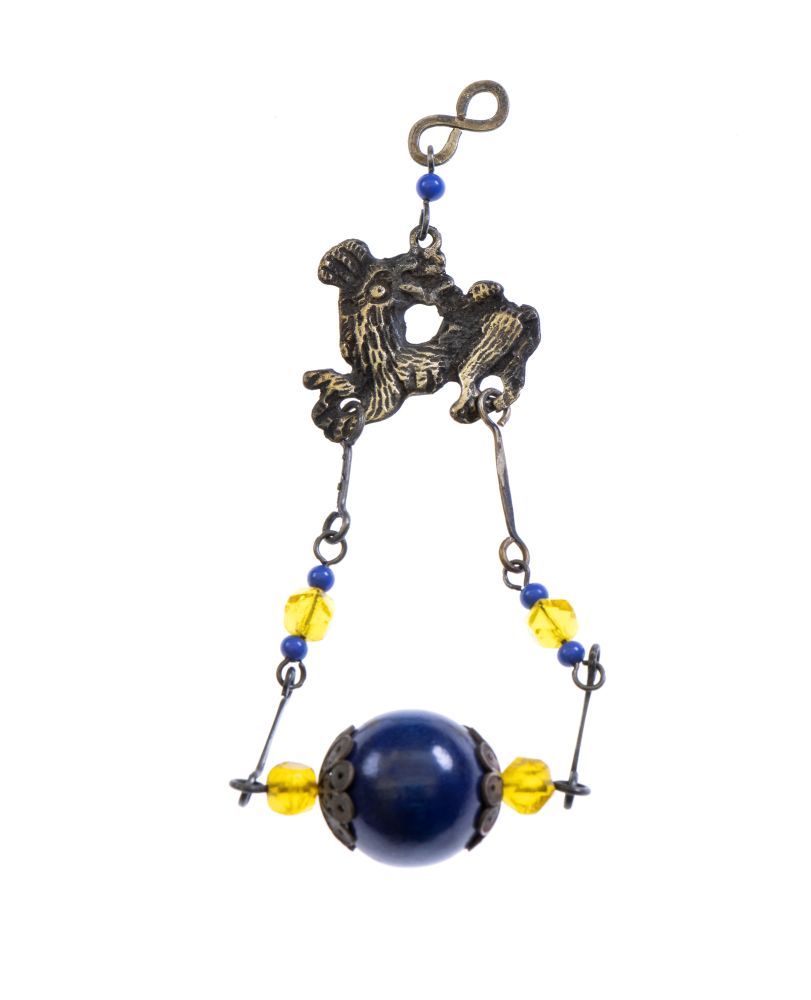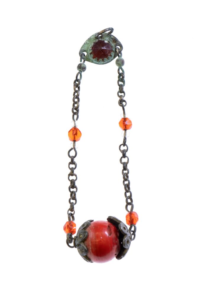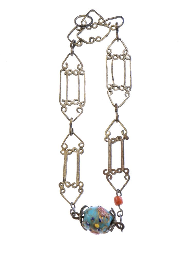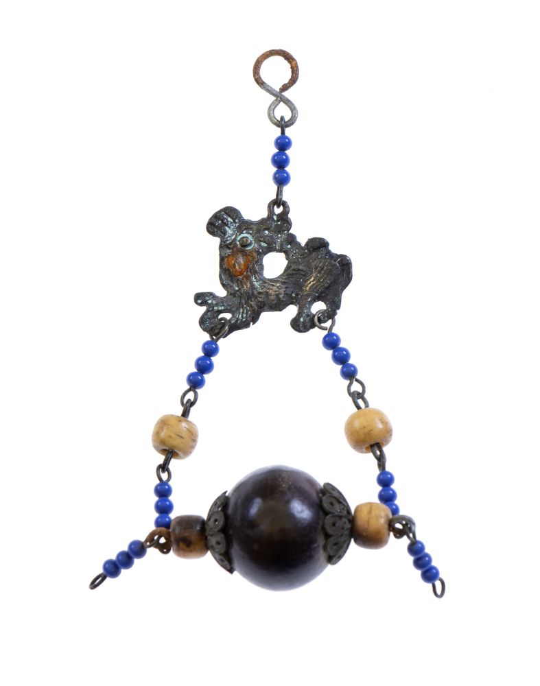 Composto da 4 pendenti in argento usati come amuleti contro il malocchio, decorati con inserti in legno colorato di blu, rosso e marrone e piccole perline di pasta vitrea colorata alternate.