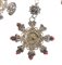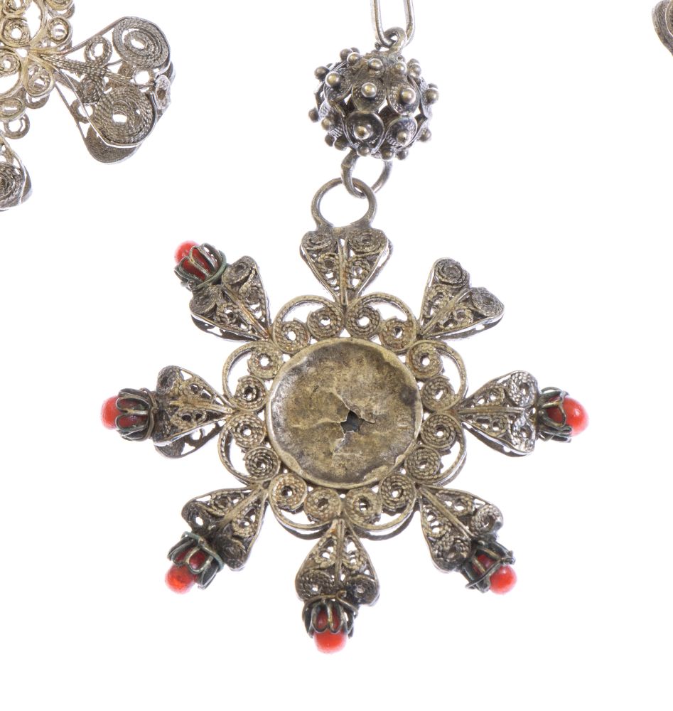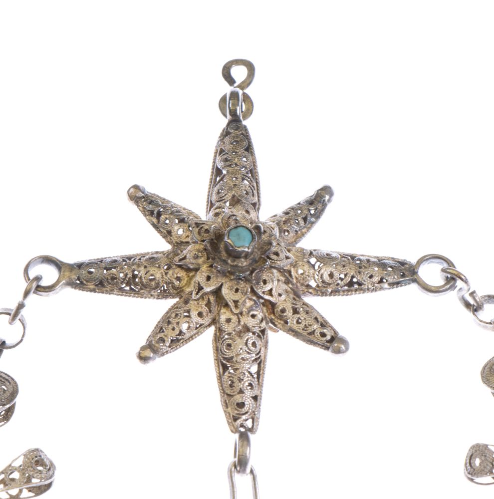Lavorato a filigrana e a traforo, l’oggetto veniva realizzato come premio o medaglia di riconoscimento, come conferma l’uso dell’argento e dei dettagli in corallo e turchese. La forma a stella, con numerose punte, simboleggia l’onorificenza, ciascuna delle quali rappresenta un valore o una virtù.