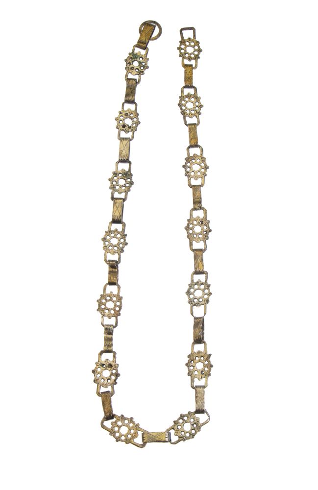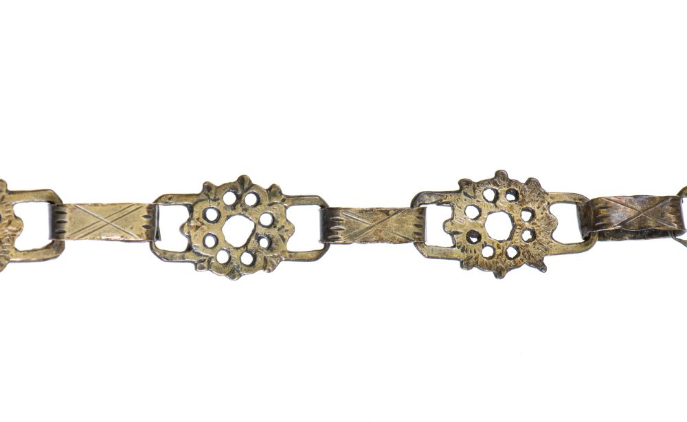 composta da una serie di maglie alternate tra elementi rettangolari incisi e rosette traforate floreali. Le rosette, disposte a intervalli regolari, richiamano simboli solari o floreali.