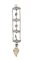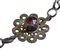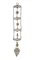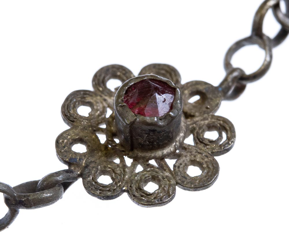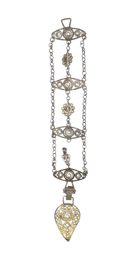 lavorato a filigrana. La composizione è costituita da quattro elementi allungati, ciascuno decorato con motivi circolari, collegati tra loro da sottili catene alternate a elementi floreali impreziositi da pietre rosse incastonate. La parte inferiore si conclude con un elemento a goccia capovolta, che riprende e richiama le decorazioni dei segmenti superiori.