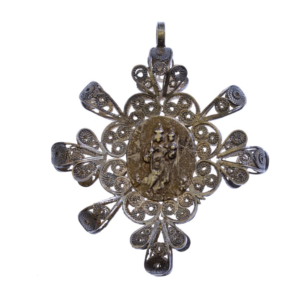 Decorato in filigrana con elementi floreali presenta al centro un medaglione con due figure consumate, raffiguranti probabilmente la Vergine e il Bambino.