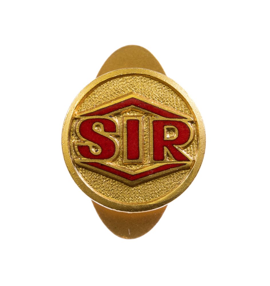 Di forma ovale, con al centro la scritta in smalto rosso SIR, Società Italiana Resine.