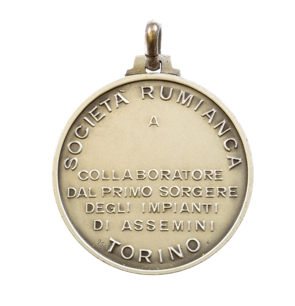 In onore della collaborazione della società Rumianca di Torino all’edificazione degli impianti di assemini, come riportato dalla dicitura sul retro. Sul fronte, lo stemma societario.