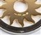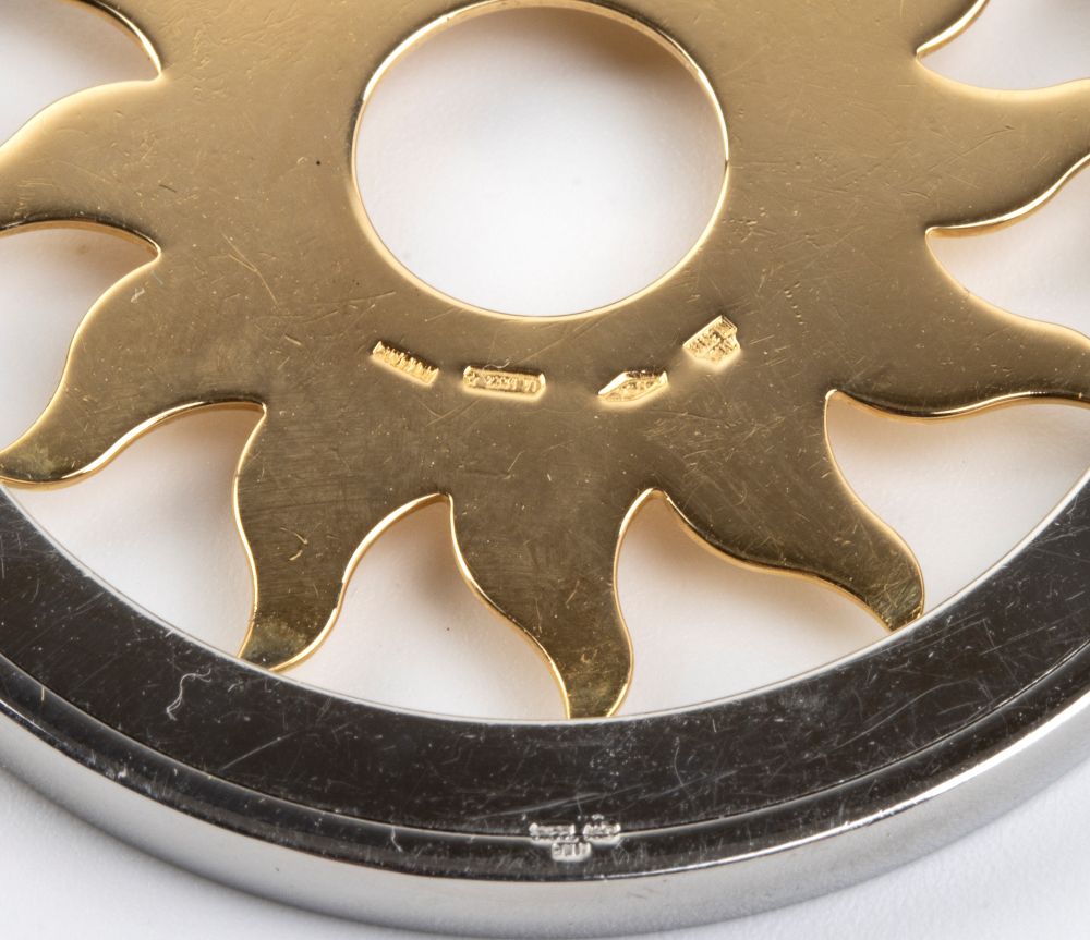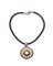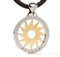 il pendente, raffigurante un sole in oro giallo 18k inscritto in un cerchio in acciaio, è sospeso ad un laccio in caucciù. Firmato "BVLGARI".