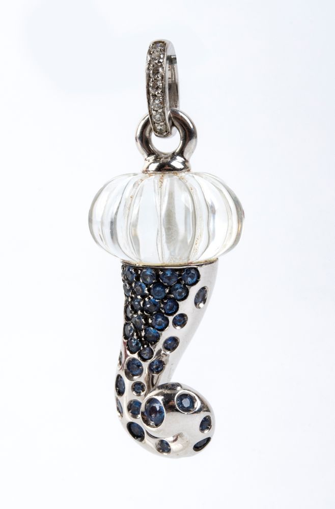 Ciondolo Cornetto in oro con zaffiri, diamanti e cristallo di rocca