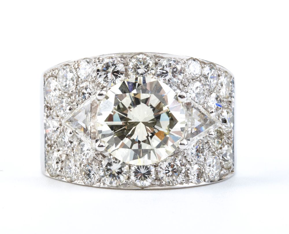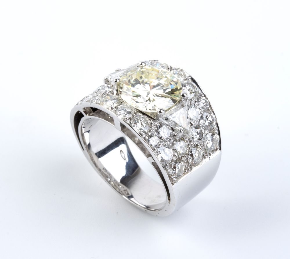 modellato come una fascia in oro bianco 18k, incastonato con diamante taglio brillante affiancato da coppia di diamanti triangolari, lati della montatura in pavé di diamanti taglio brillante. Firmato "F. MORONI".
