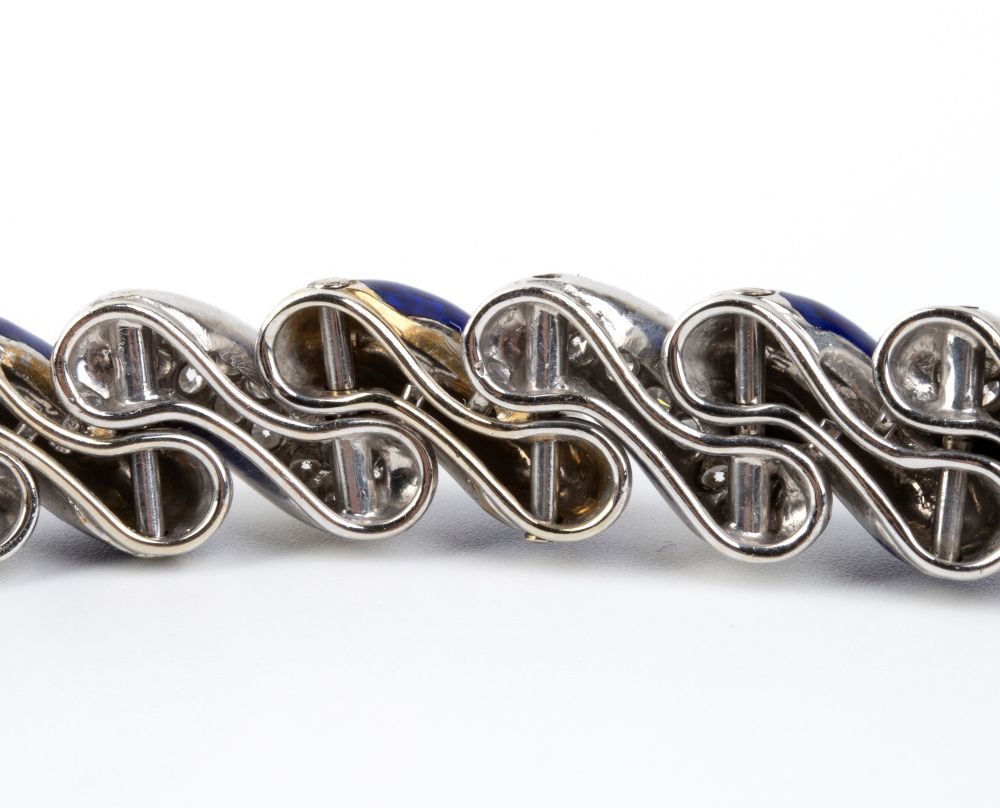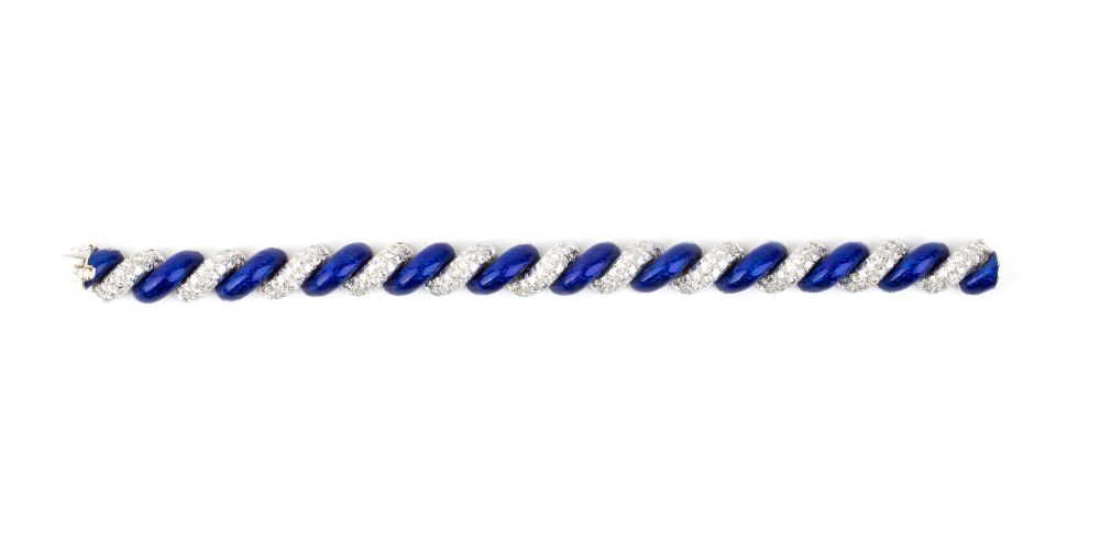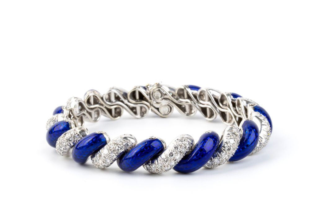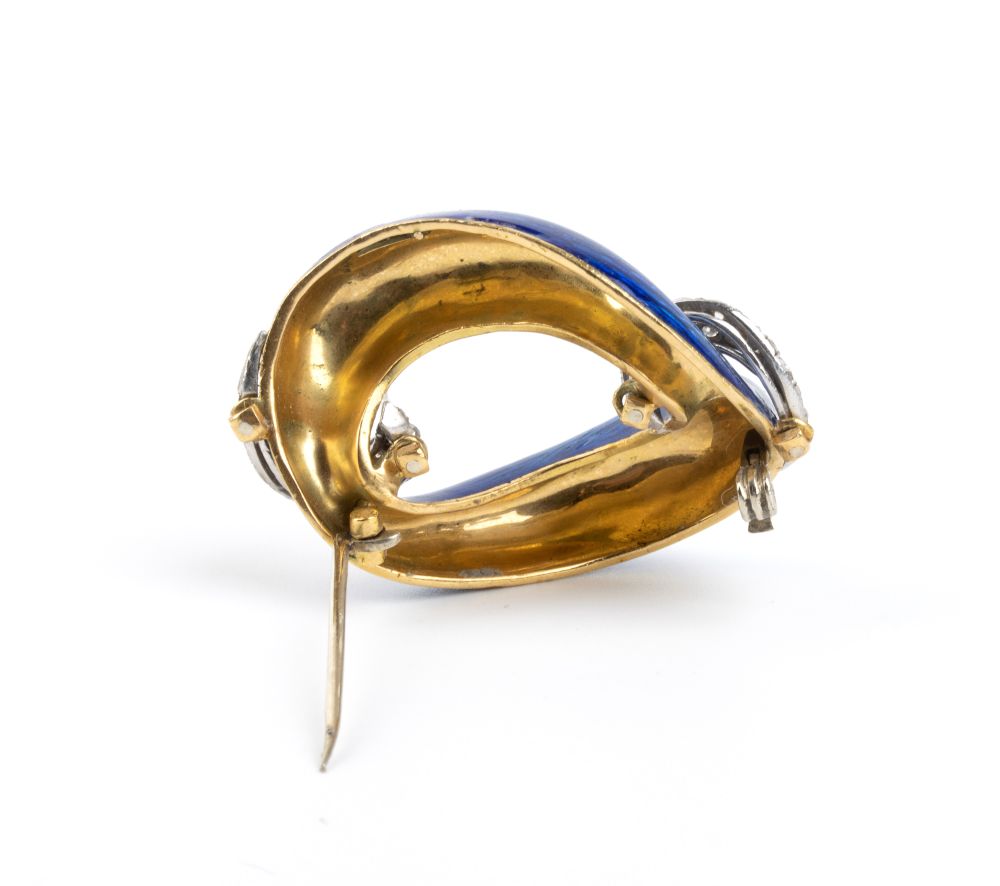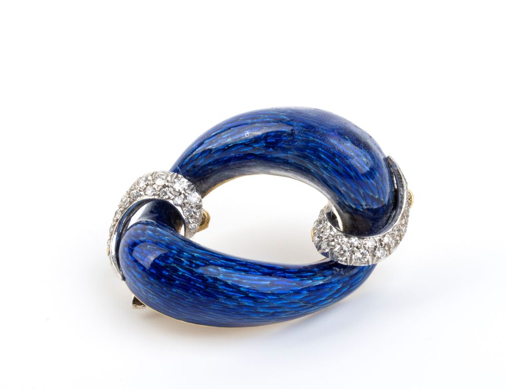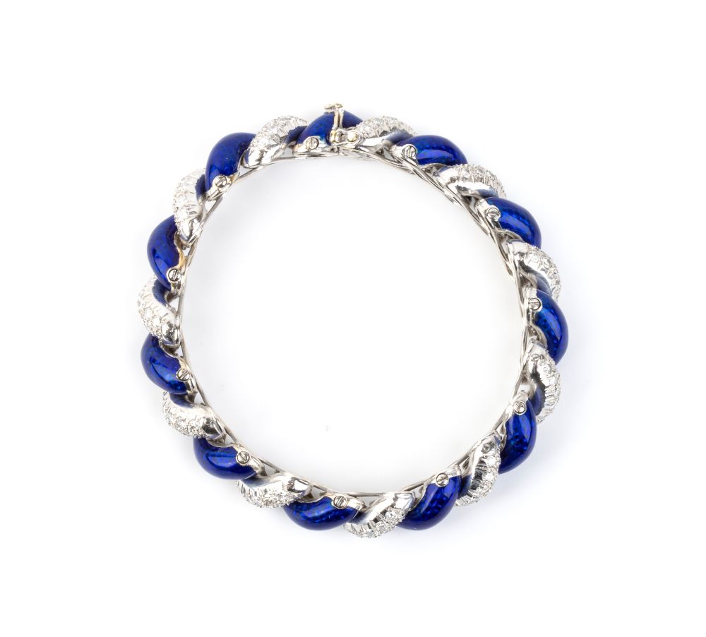 Bracciale e spilla in oro con smalto blu e diamanti