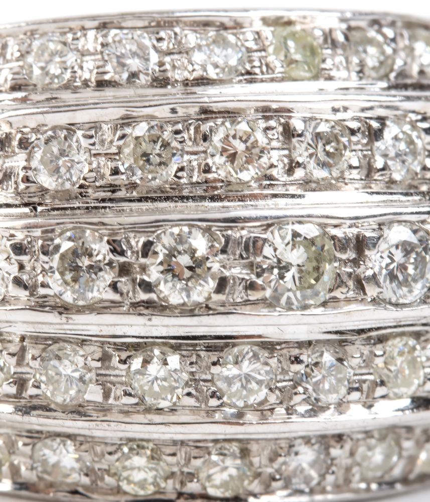 incastonato con cinque file di diamanti taglio brillante, stimati per un peso totale di circa 1.10 ct, colore H-I, purezza VS- SI.