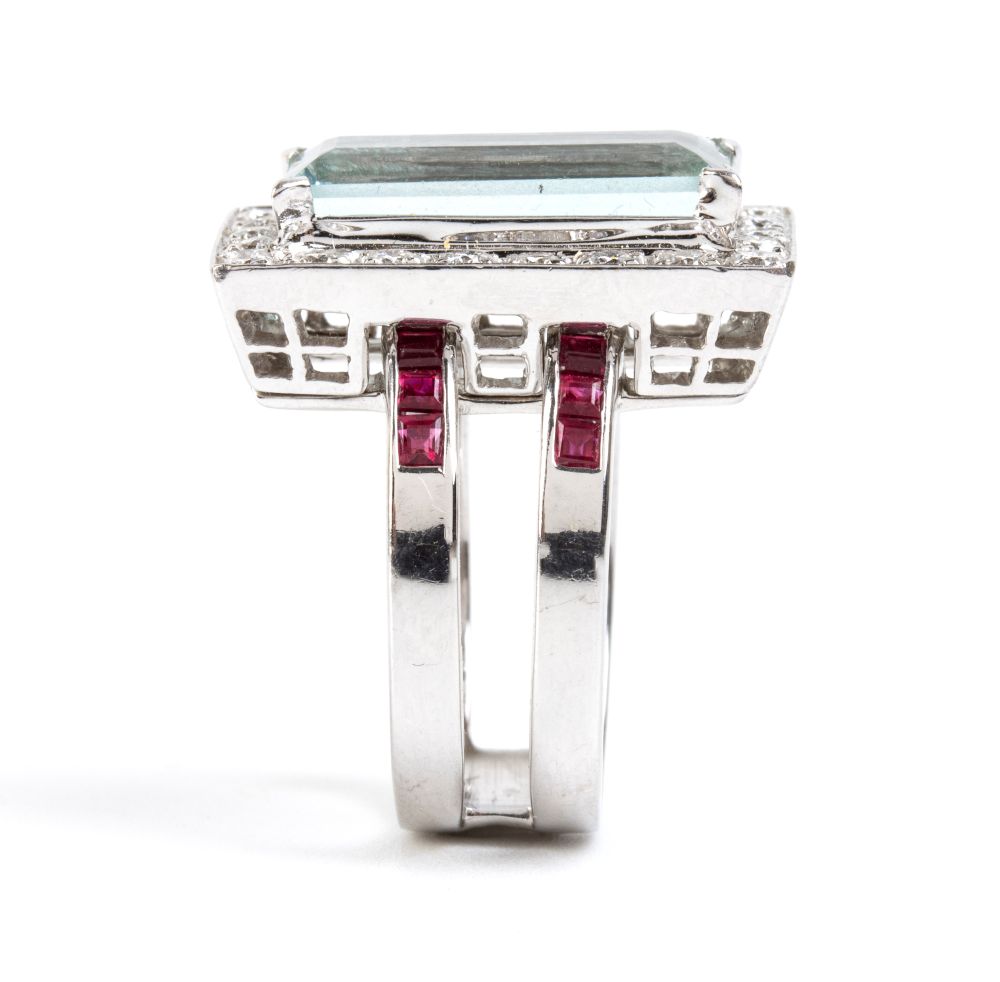 Di forma geometrica, impreziosito da un’acquamarina incorniciata da diamanti e file di rubini sulla fascia laterale.