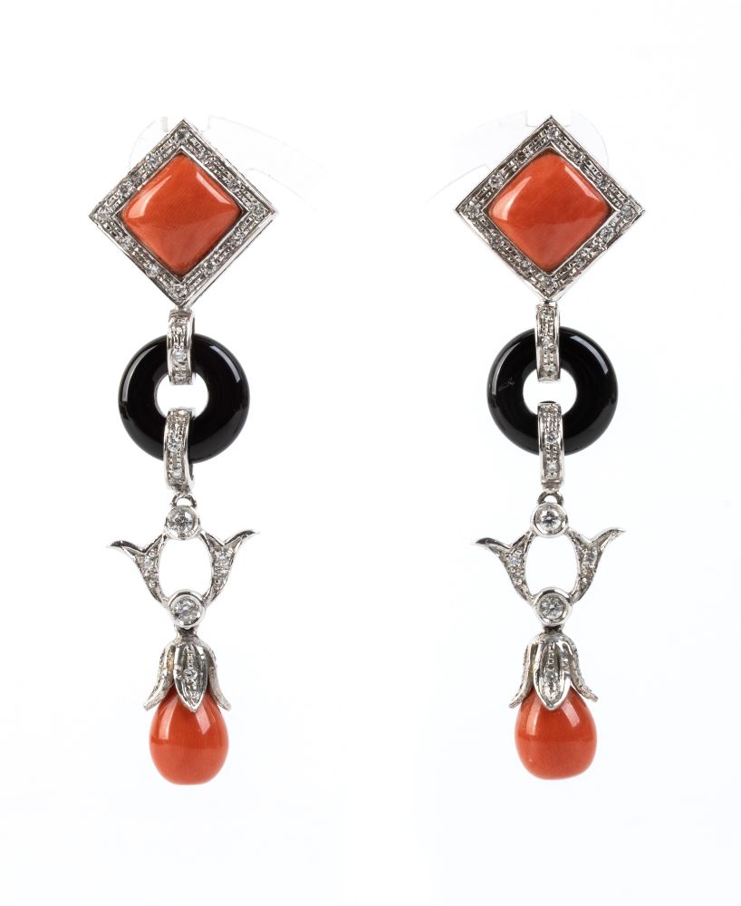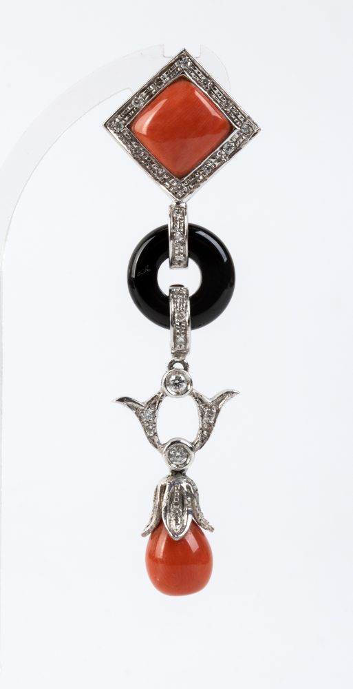 Orecchini pendenti in oro con corallo cerasuolo, onice e diamanti