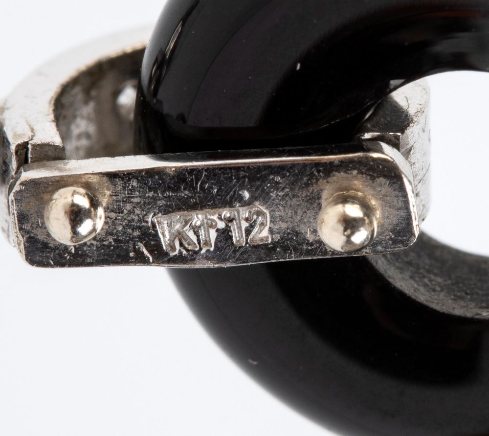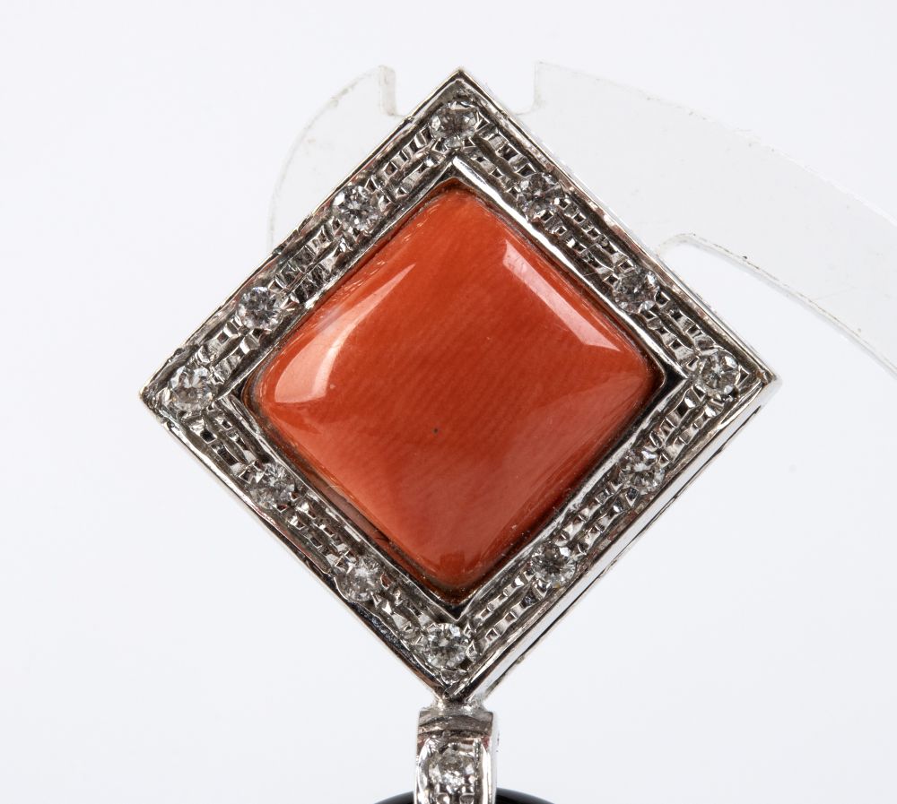 in oro bianco, in linea di elementi geometrici in onice e Corallo Cerasuolo (Corallium Elatius), dettagli in diamanti taglio brillante, di circa 0.60 ct, colore H-I, purezza VS- SI.